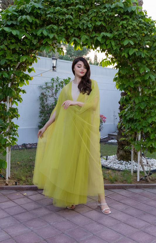 تتميز هذه القطعة بلون أخضر ليموني نابض بالحياة وتصميم عباءة واسع، وهي مصنوعة من طبقات...