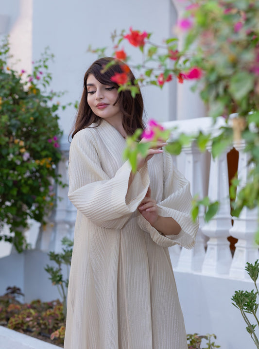 ارتقِ بإطلالتك مع هذه العباءة الآسرة المفتوحة من الأمام بلون الشمبانيا الفاتح الجميل. يتميز القماش...