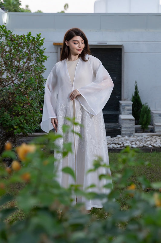 قطعة مميزة، تتميز هذه العباءة العاجية الفاتحة بتصميم انسيابي مفتوح مصنوع من قماش شفاف جميل....