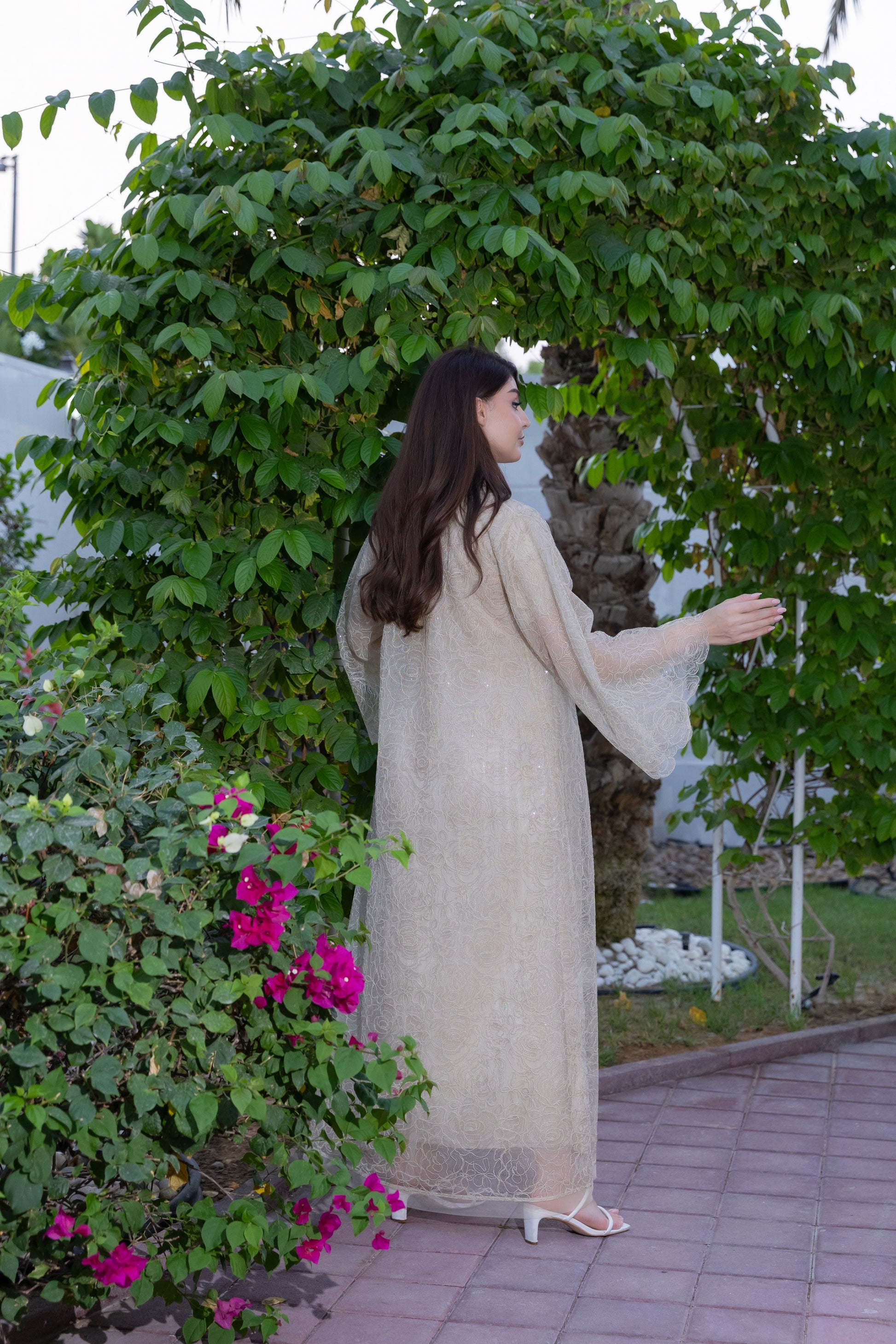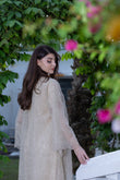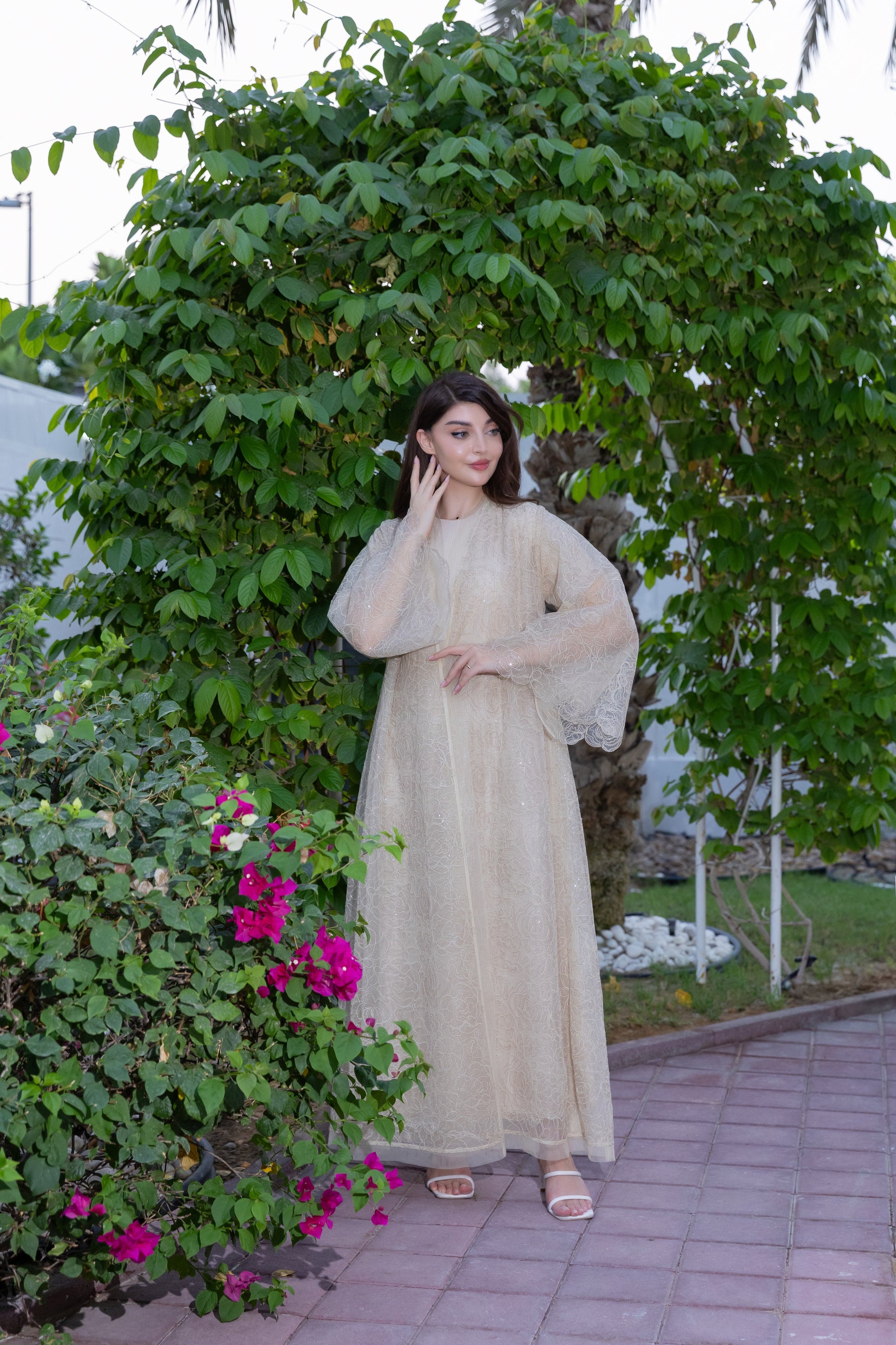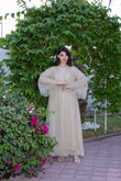 هذه عباية جميلة ورسمية للغاية، مصممة للمناسبات الاحتفالية. تتميز بتصميم مفتوح من الأمام، مصنوعة من قماش شفاف فاتح اللون (يُرجّح أن يكون لونه بيج أو شامبانيا)، مزخرف بكثافة بنمط معقد من الترتر والخرز الذهبي أو الفضي. ينساب القماش الشفاف بأناقة على طبقة داخلية، وأكمامها واسعة وفضفاضة، مما يعزز الشعور العام بالفخامة والرقي. هذه القطعة مثالية للحفلات المسائية، وحفلات الزفاف، أو الاحتفالات الكبيرة التي ترغبين فيها بإطلالة متألقة وجذابة.