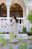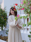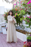 ارتقِ بإطلالتك مع هذه العباءة الآسرة المفتوحة من الأمام بلون الشمبانيا الفاتح الجميل. يتميز القماش بملمسه الناعم، مع طيات دقيقة أو تضليعات عمودية رقيقة، مما يمنحها عمقًا استثنائيًا ولمعانًا رقيقًا. تضفي الأكمام الواسعة والمهيكلة على شكل جرس لمسة عصرية وهندسية على التصميم الأنيق والانسيابية. تُعد هذه العباءة رمزًا للأناقة الراقية، مثالية للتجمعات الراقية والمناسبات الخاصة التي تتطلب لمعانًا خفيفًا.