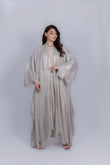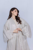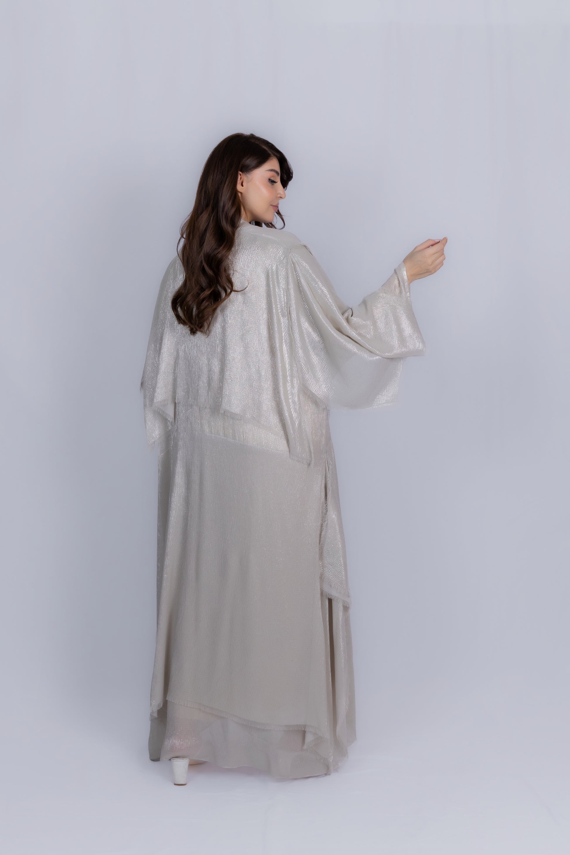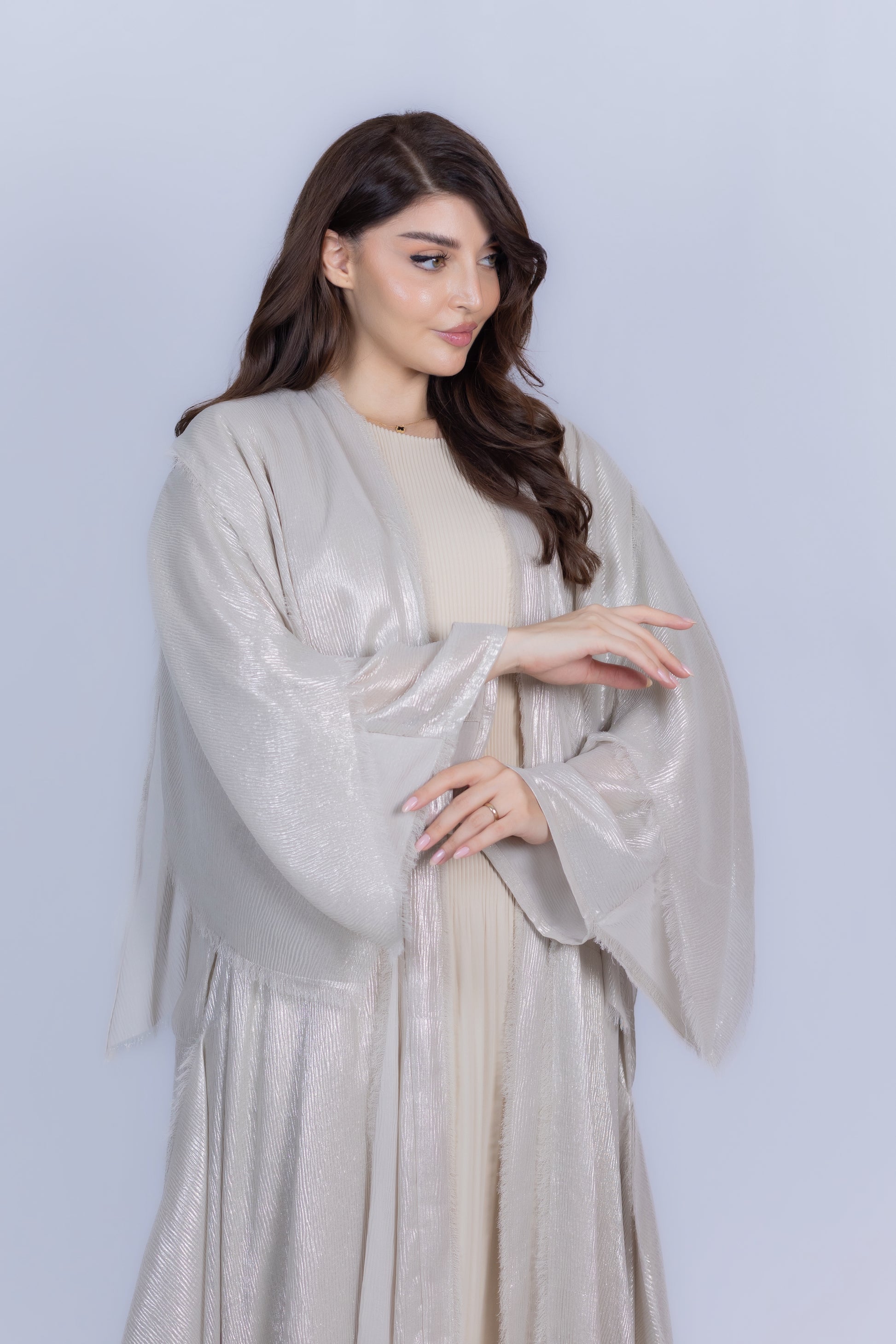 استمتعي بالضوء بجمال هذه العباءة الرائعة المفتوحة من الأمام. مصنوعة من قماش مزخرف بلمسة نهائية آسرة عاكسة للضوء، بلمسة نهائية لامعة معدنية عمودية أو منسوجة بشريط. أكمامها الواسعة على شكل كيمونو وتصميمها المفتوح يمنحانها لمسة أنيقة ومريحة. تضفي هذه العباءة لمسة من الأناقة الفورية، وهي مثالية للاحتفالات المسائية والمناسبات الراقية التي ترغبين في التألق فيها.