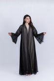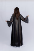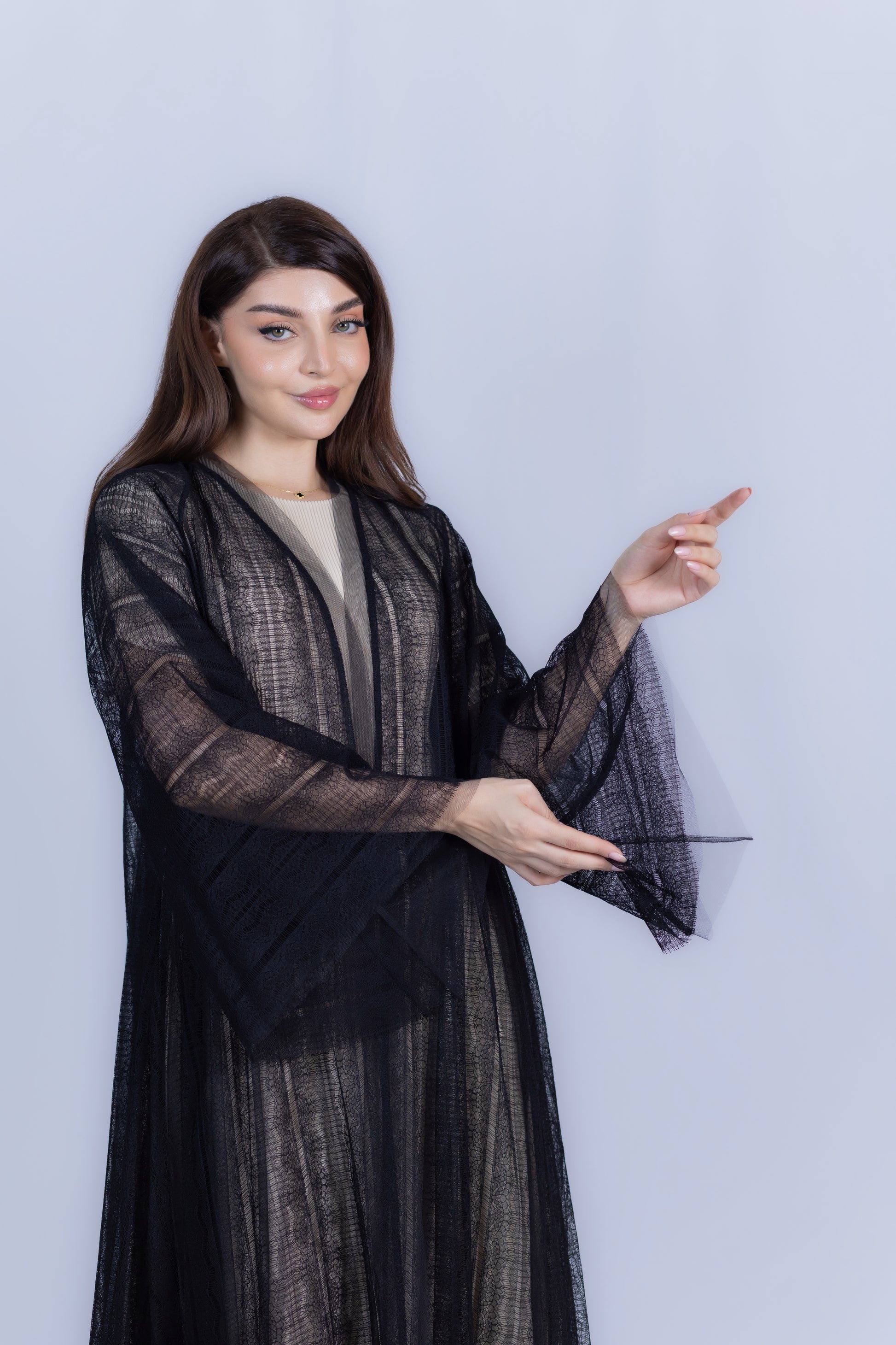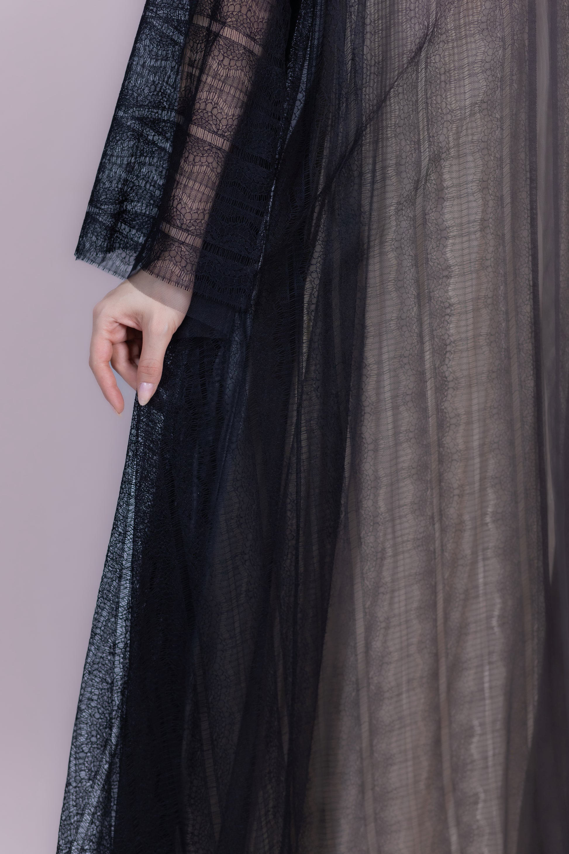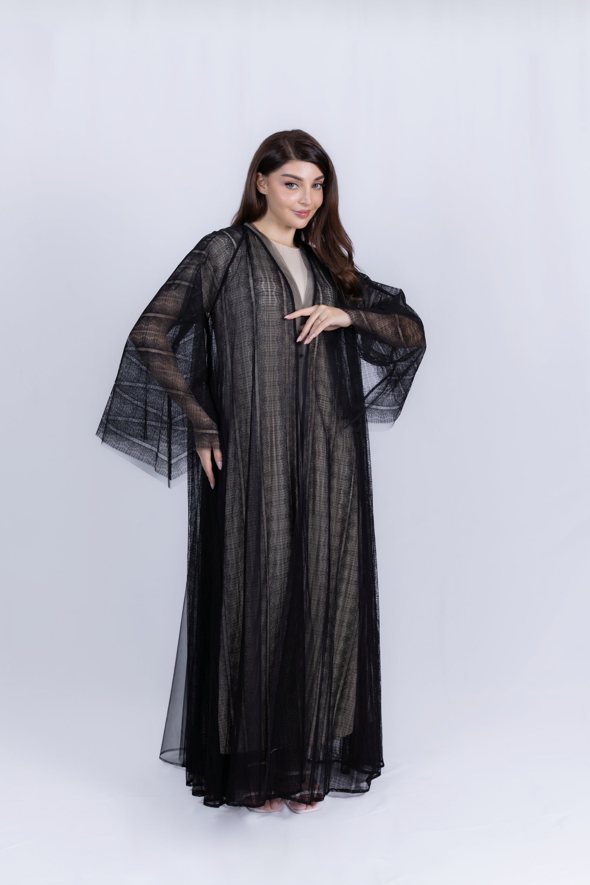 هذه العباءة السوداء الرائعة قطعة أساسية وجذابة تُضفي لمسةً مميزة على أي إطلالة. تتميز بتصميمها الواسع والمفتوح، المصنوع بالكامل من قماش شبكي أو تول شفاف ذي ملمس ناعم، مما يُضفي لمسةً من الجمال والرقة على ملابسكِ الداخلية. تُبرز الأكمام الواسعة المنسدلة انسيابية الفستان وجاذبيته. بسيطة وجذابة في آنٍ واحد، تُعدّ هذه القطعة إضافةً أنيقةً لأي خزانة ملابس، مثاليةً للمناسبات المسائية، والتجمعات الراقية، وحفلات العشاء الأنيقة.