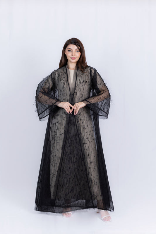 This open-front abaya is crafted from a voluminous, finely textured black mesh or tulle fabric...