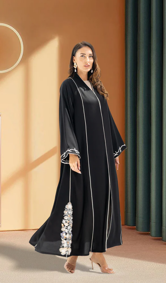 This abaya features a sleek black base with crisp white piping outlining the front and sleeves. It...