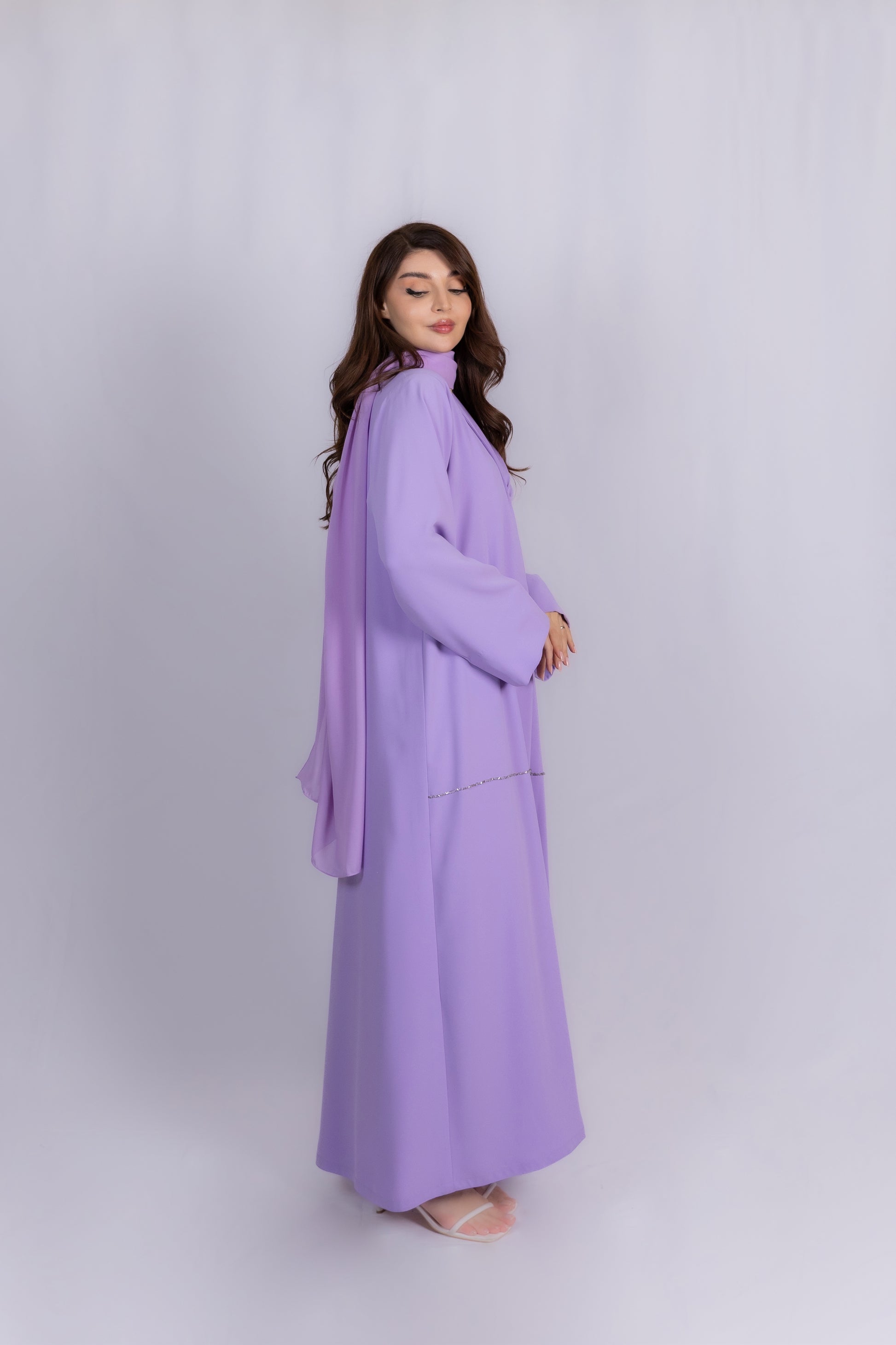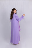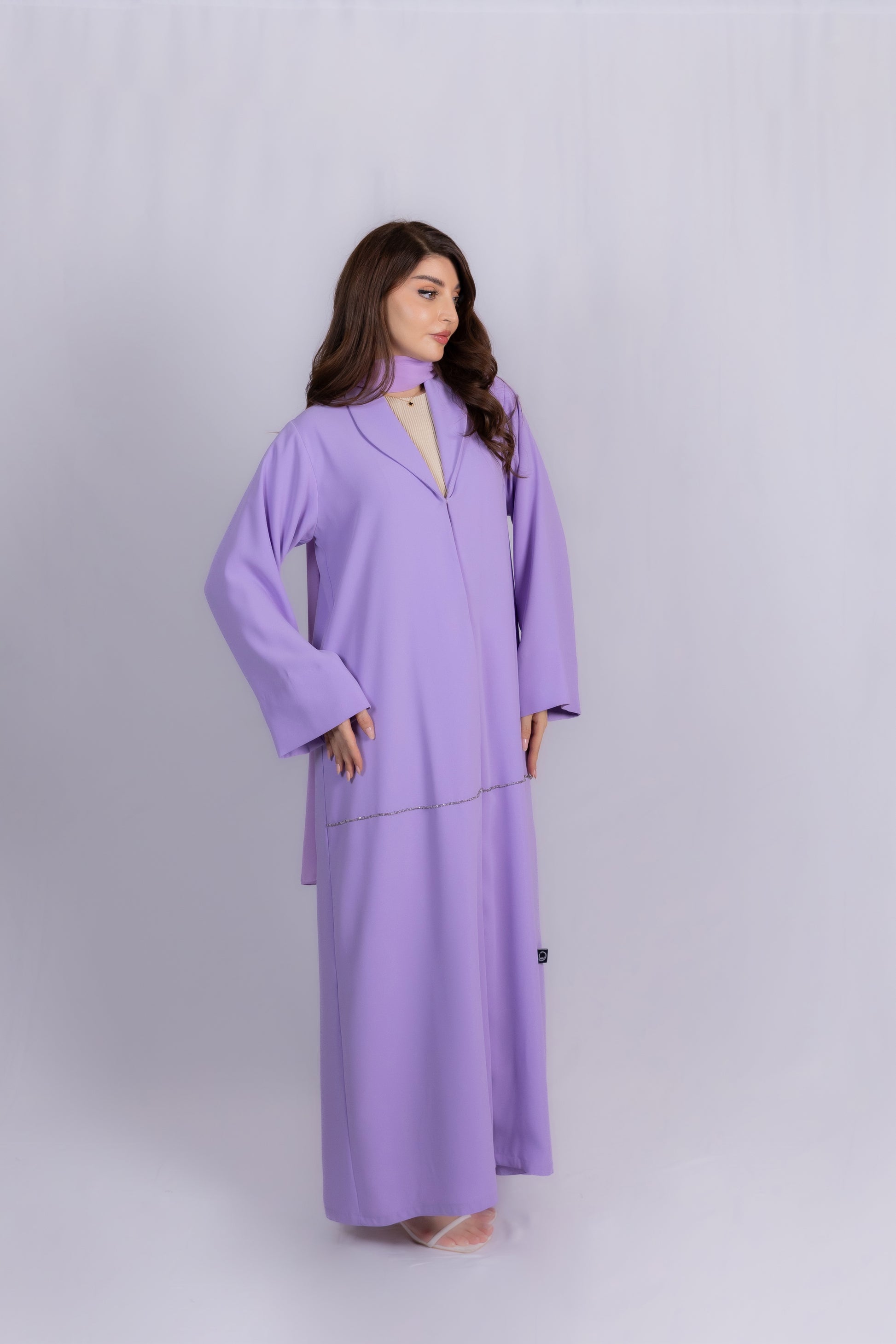 This soft lavender abaya features a minimalist, flowy silhouette with wide sleeves and a smooth shawl-style collar. Its understated design is elevated by a delicate metallic trim near the hem, giving it a refined yet effortless look. Perfect for everyday wear, office settings, or relaxed occasions where comfort and elegance are equally important.