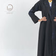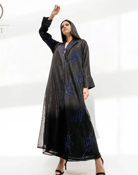 This abaya is made from black net fabric, offering a soft, sheer look with a graceful drape. It features a straight silhouette with a structured lapel collar and long sleeves for a modern touch. Scattered blue sequin embroidery adds a hint of shimmer, creating a subtle yet striking contrast against the dark base. Elegant and lightweight, it's perfect for evening occasions or special events.