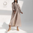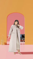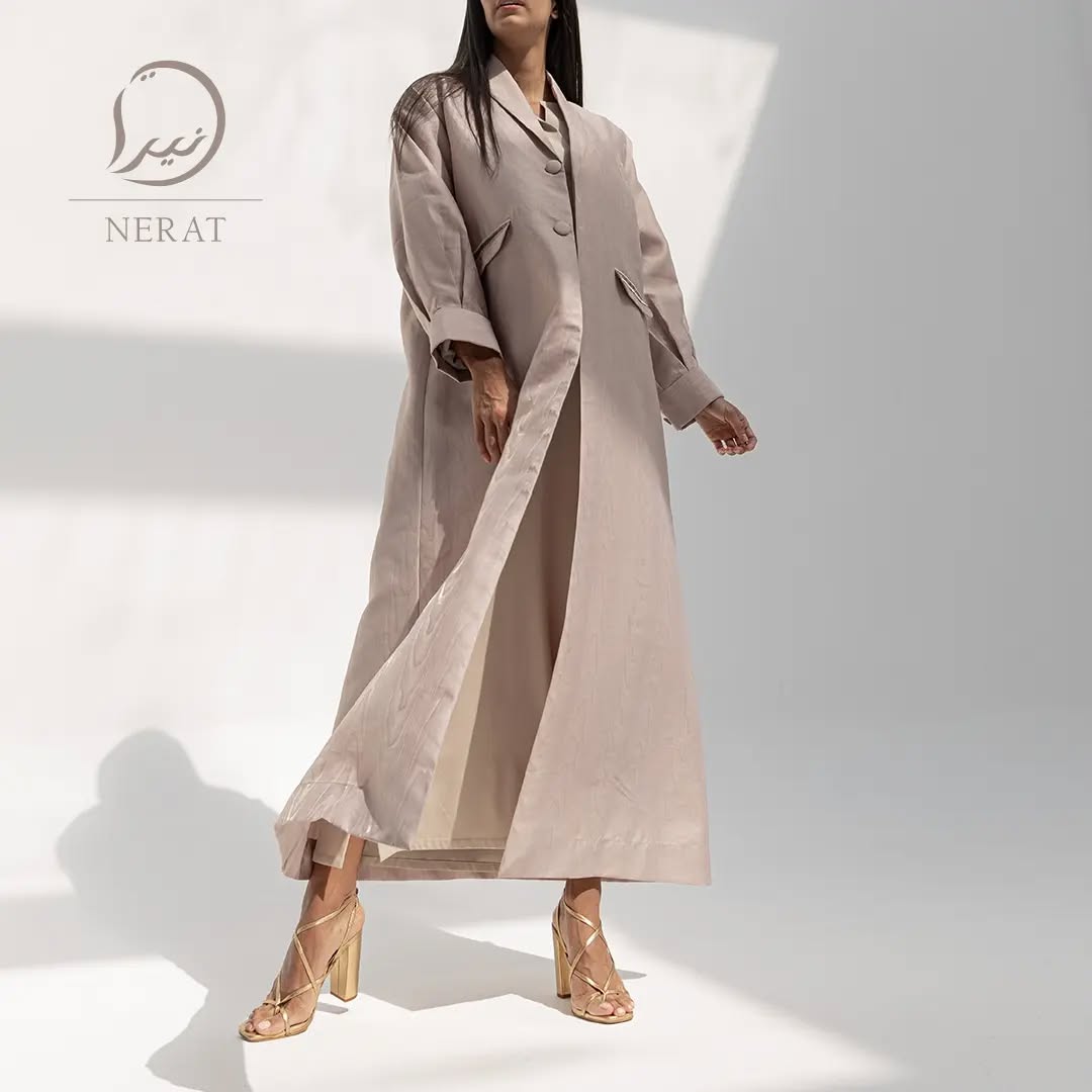 This abaya is made from smooth beige fabric with a subtle sheen, featuring a structured blazer-style collar and buttons. It has long, relaxed sleeves and flap pockets, creating a polished yet minimalist look. The open front reveals a matching inner layer, adding depth to the design. Perfect for elegant, modern styling.