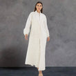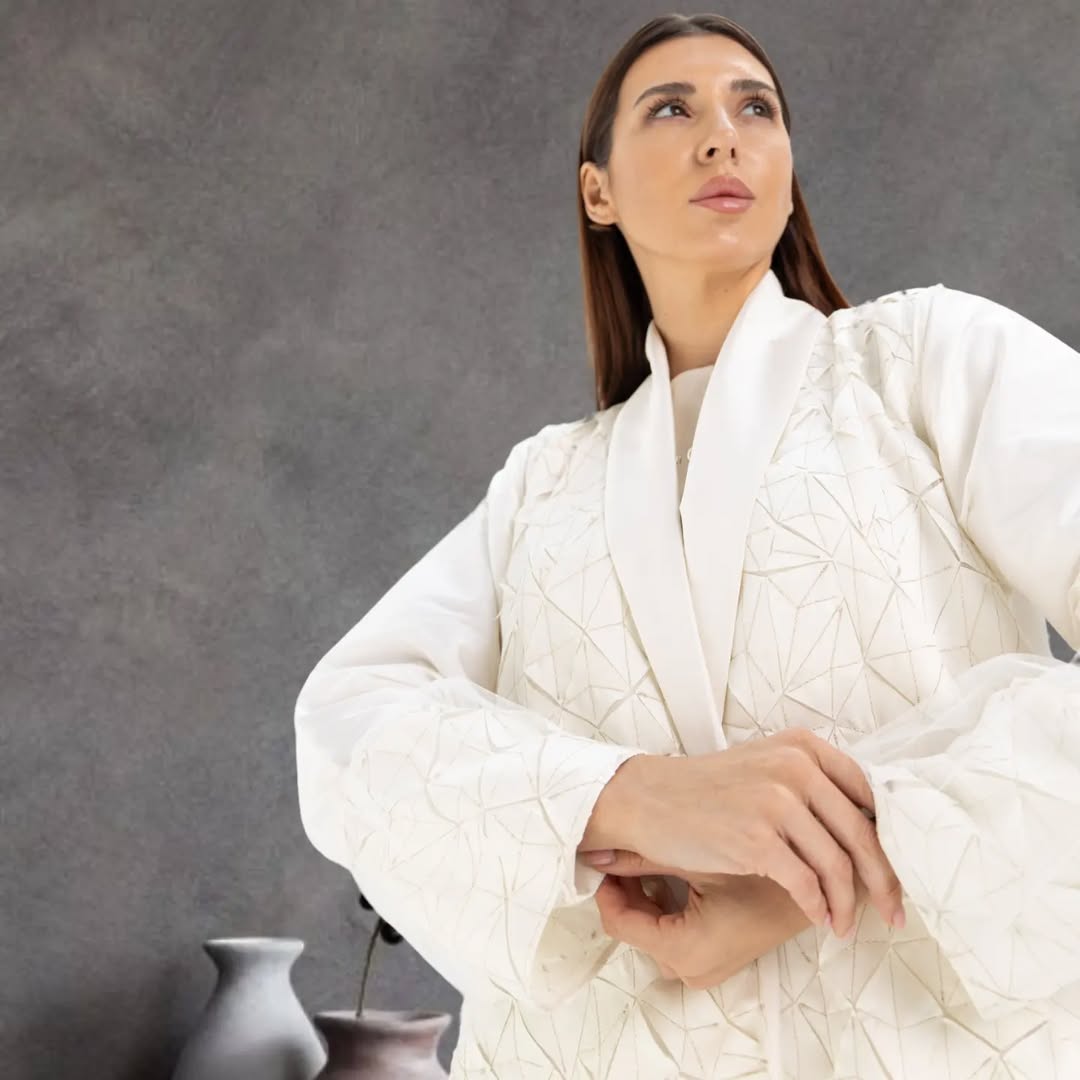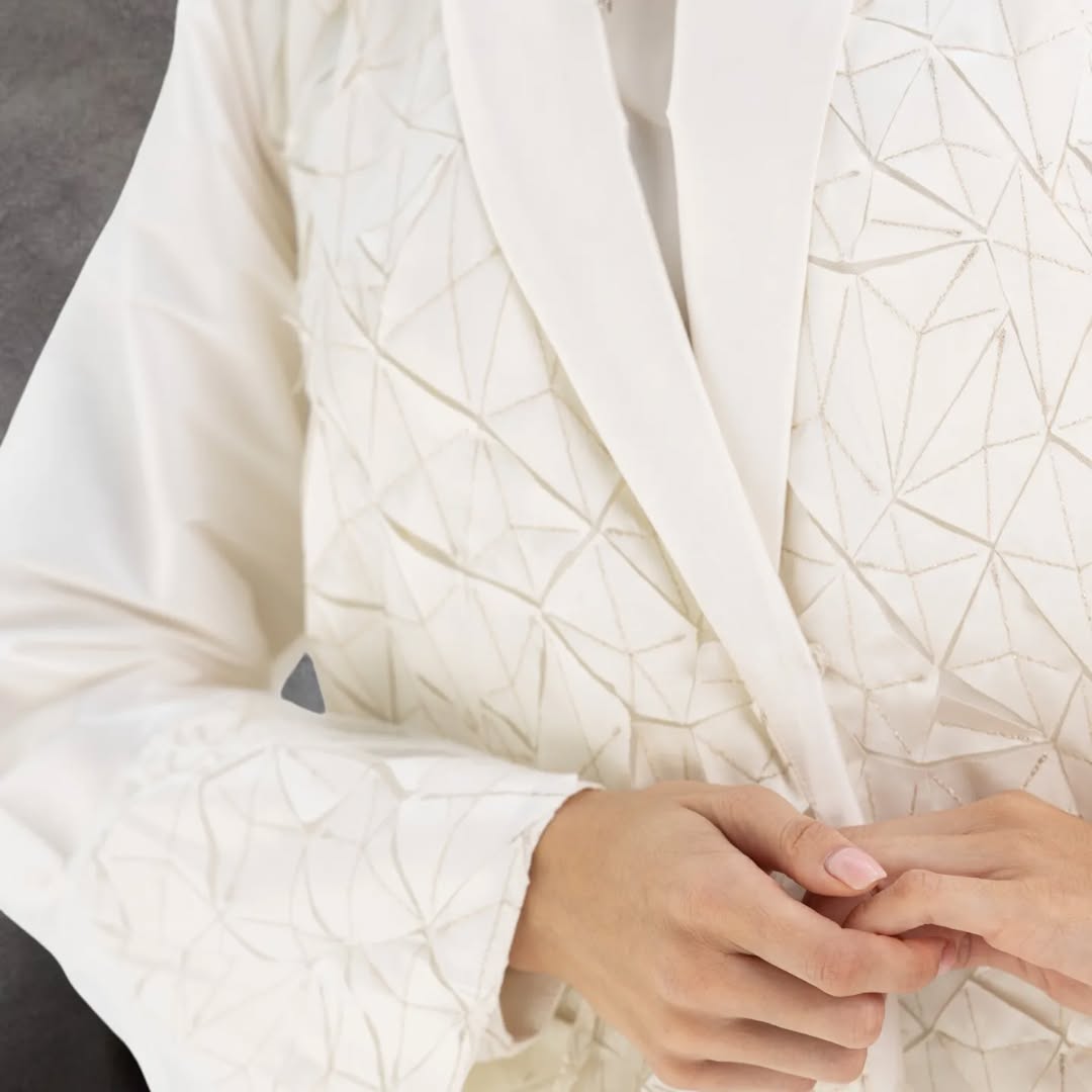 The front panels feature a geometric stitched pattern of interlocking lines, adding texture and depth to the otherwise smooth fabric. A wide shawl collar frames the neckline, while the straight-cut silhouette and long sleeves maintain a classic, modest shape. The combination of subtle detailing and crisp color makes this piece ideal for refined, contemporary styling.