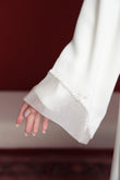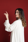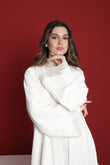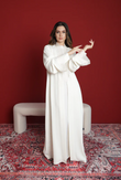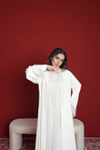 This abaya is an elegant and graceful piece in a soft off-white or ivory hue, exuding a refined simplicity. It features delicate embellishments along the front and sleeves, likely beadwork or embroidery, arranged in a subtle scalloped pattern that adds a touch of femininity and charm. The fabric appears lightweight and flowy, offering a gentle drape. With its clean lines, covered buttons down the front, and modest silhouette, this abaya is ideal for formal or special occasions, offering a sophisticated yet understated look.
