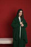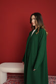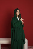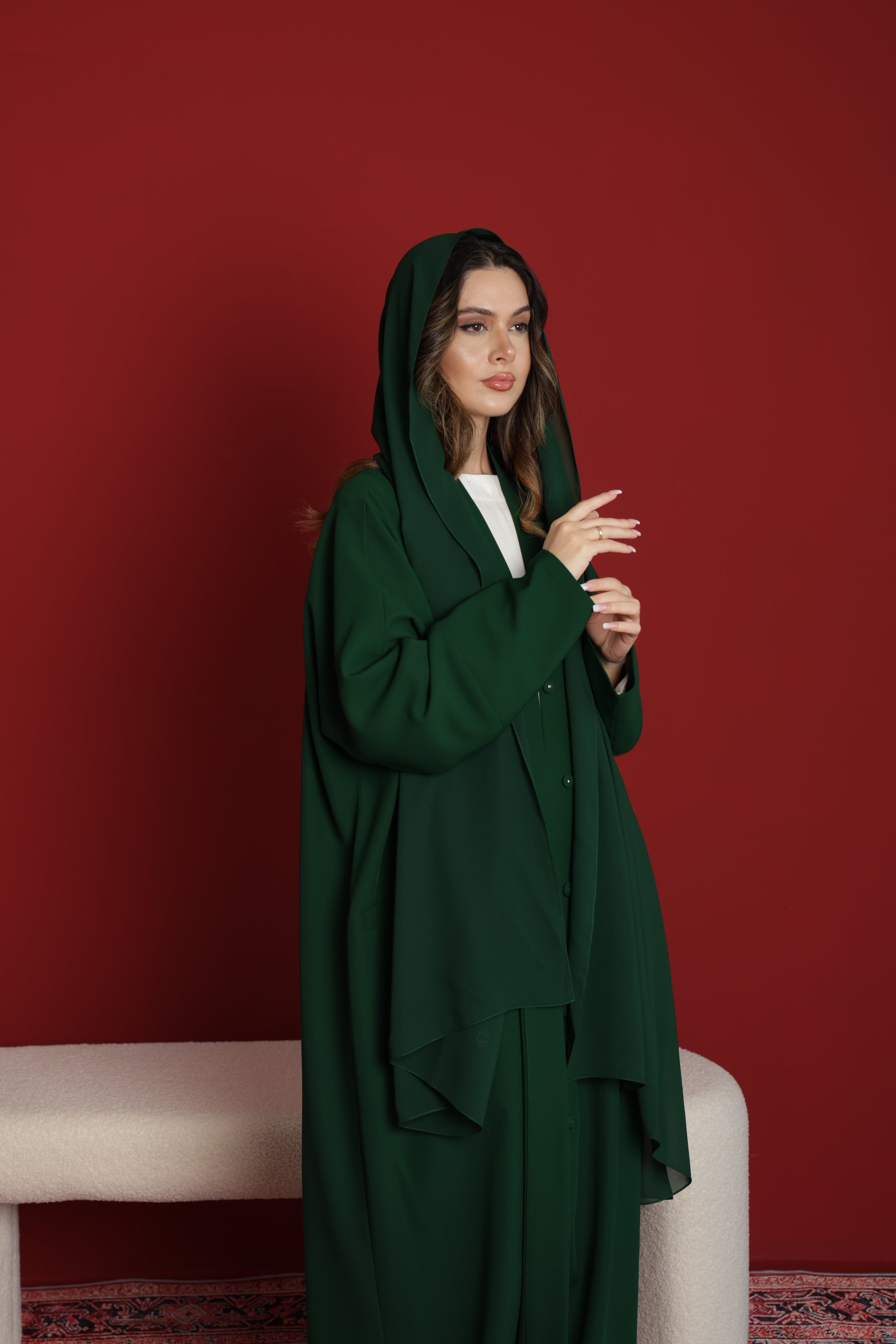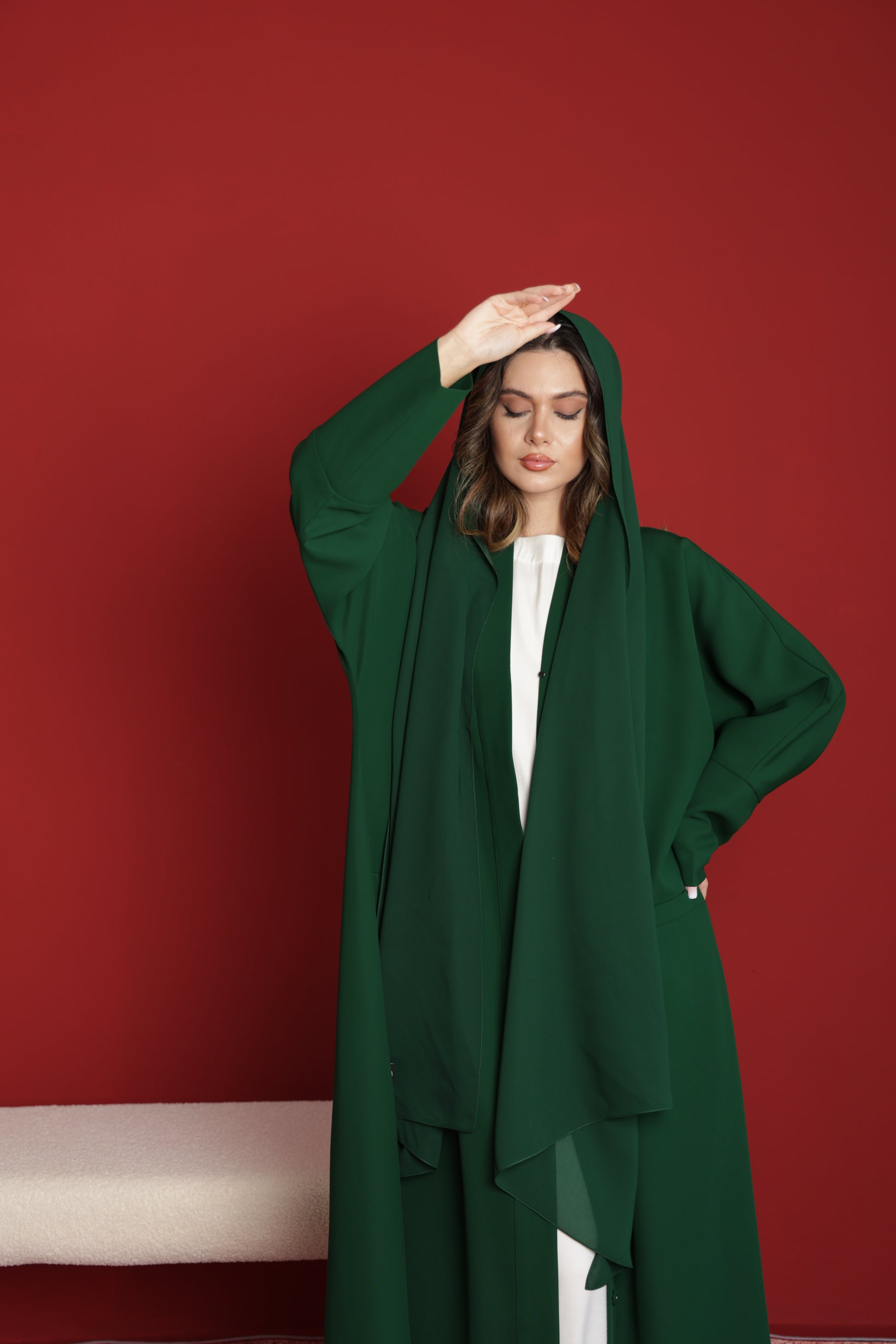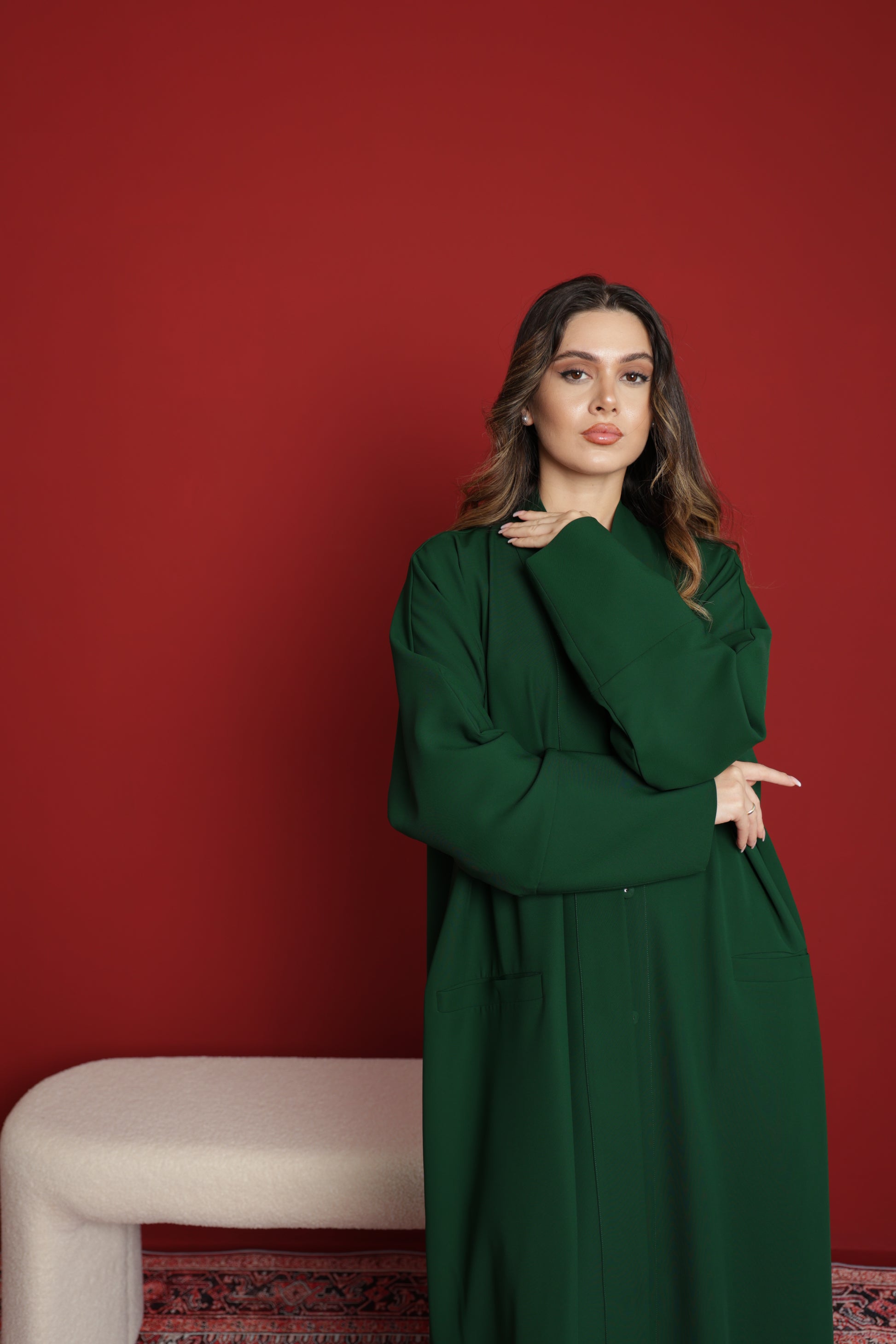This abaya is a striking piece in a rich emerald green shade, showcasing a clean and minimalistic design. It features a loose, flowing silhouette with a straight cut and subtle tailoring for a polished look. The abaya includes practical front pockets and a button-down closure, while its wide sleeves add a touch of contemporary elegance. Perfect for both casual and formal settings, this design blends simplicity with bold color for a timeless yet modern appeal.
