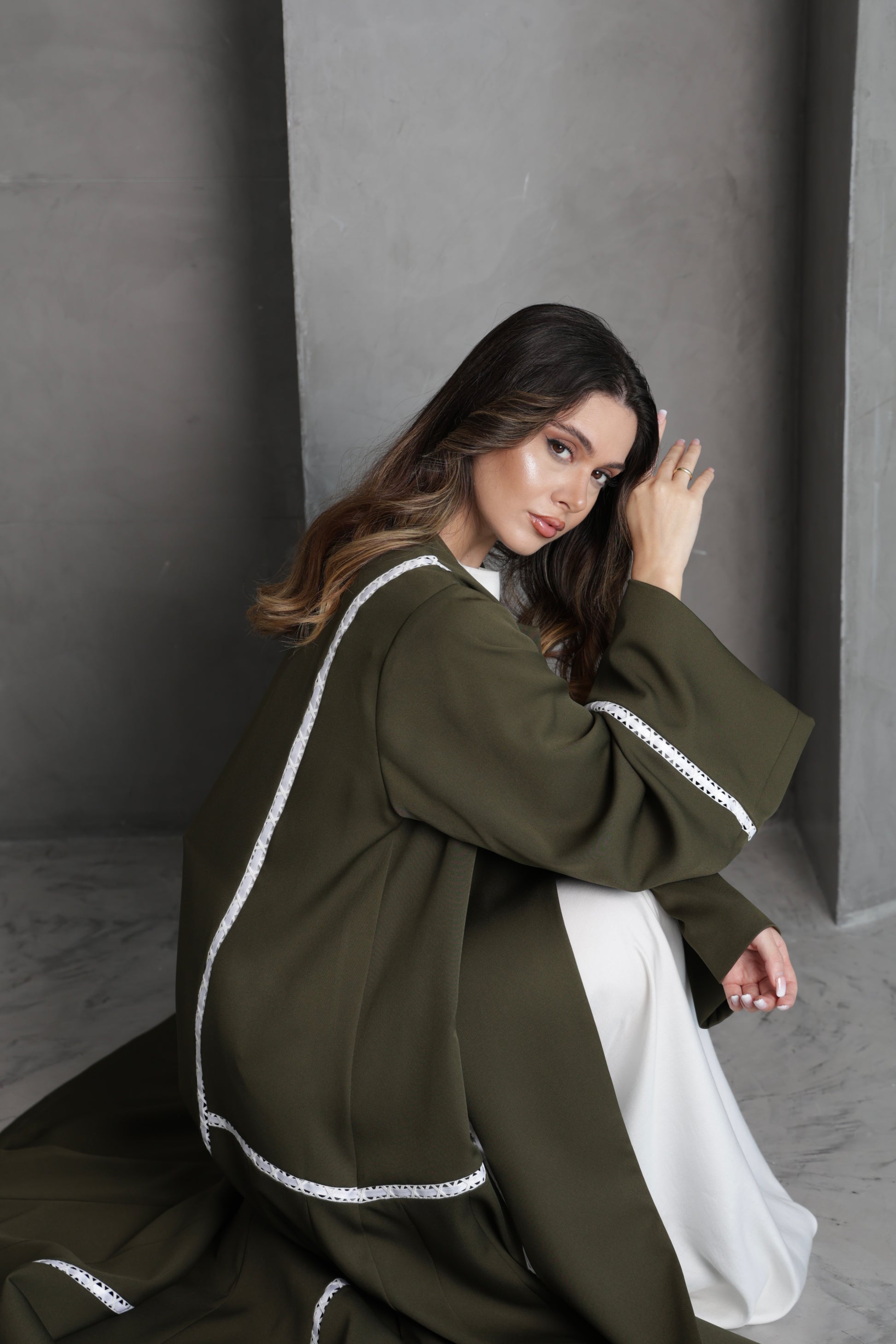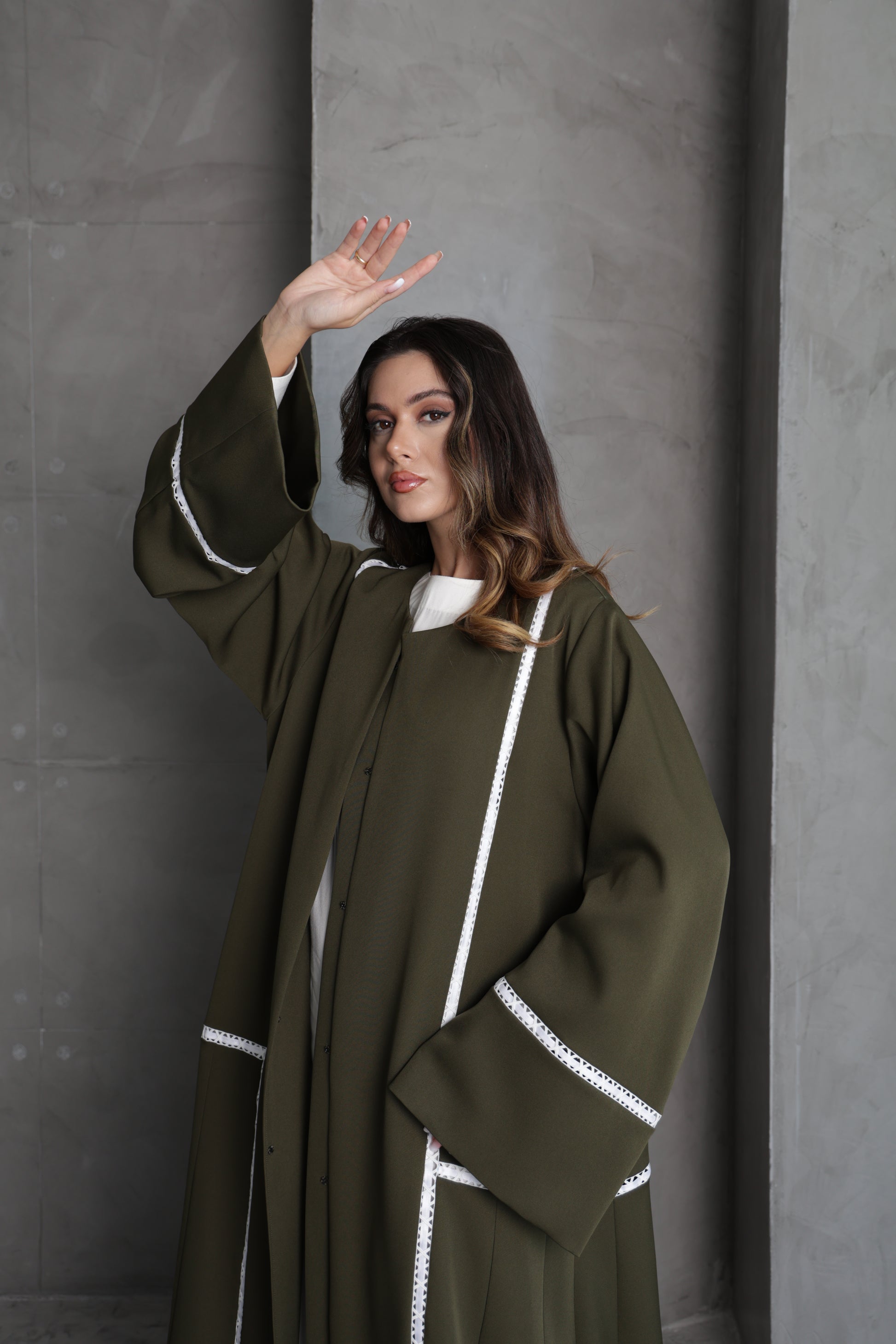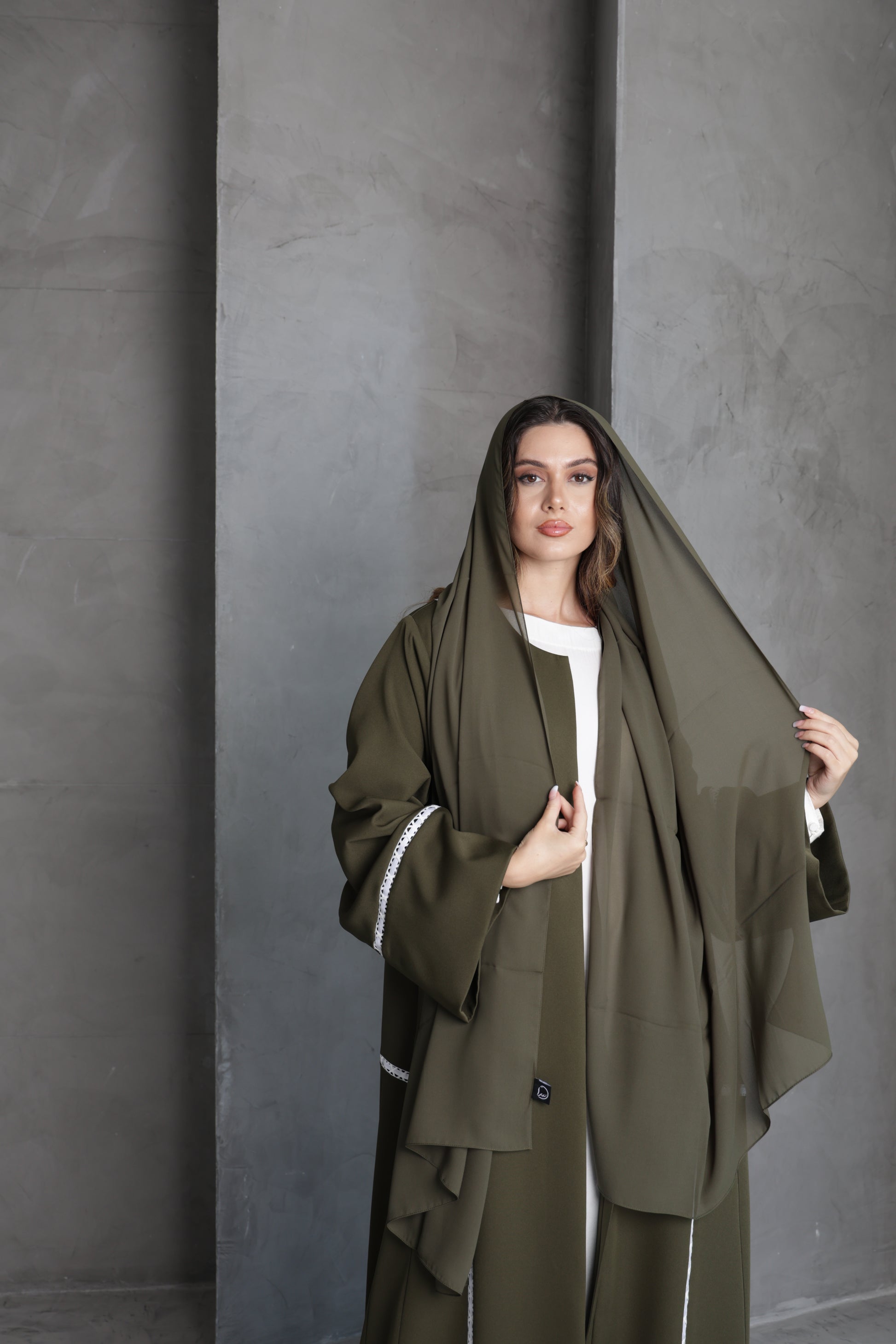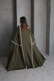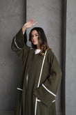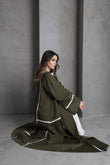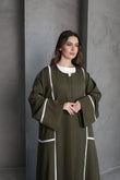 This olive green abaya is designed with flowing lines and accented by delicate white lace trim along the sleeves and front panels. The contrast detailing adds a touch of sophistication, making it a versatile piece for both everyday elegance and special occasions.