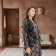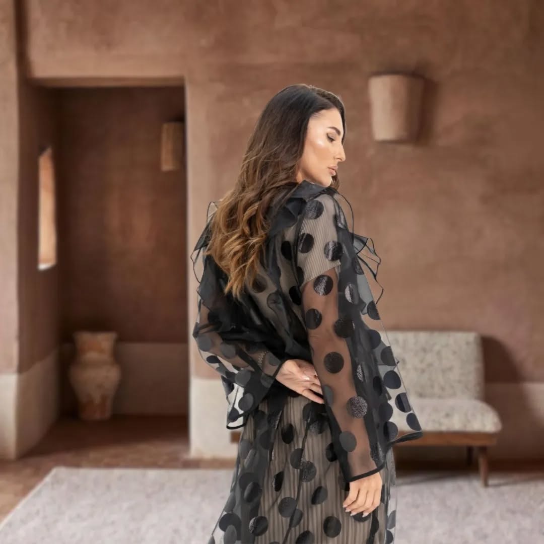 This striking party abaya is crafted from sheer black organza, offering a luxurious and lightweight feel. The fabric is embellished with large, glossy black polka dots that add a bold, modern flair. The abaya features an open-front design with a relaxed, flowing silhouette that drapes elegantly over the body. Wide, flared sleeves enhance its graceful movement, while the semi-sheer texture adds a hint of glamour, ideal for evening or formal events.