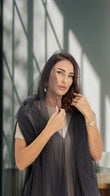 This abaya is crafted from a sheer black fabric embellished with fine white or silver speckles, giving it a delicate shimmer. Its lightweight, flowy texture adds an elegant and ethereal touch, while the subtle sparkle enhances its modern, sophisticated appeal. Perfect for formal occasions, it offers a graceful and stylish look on its own.