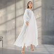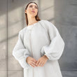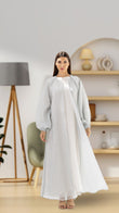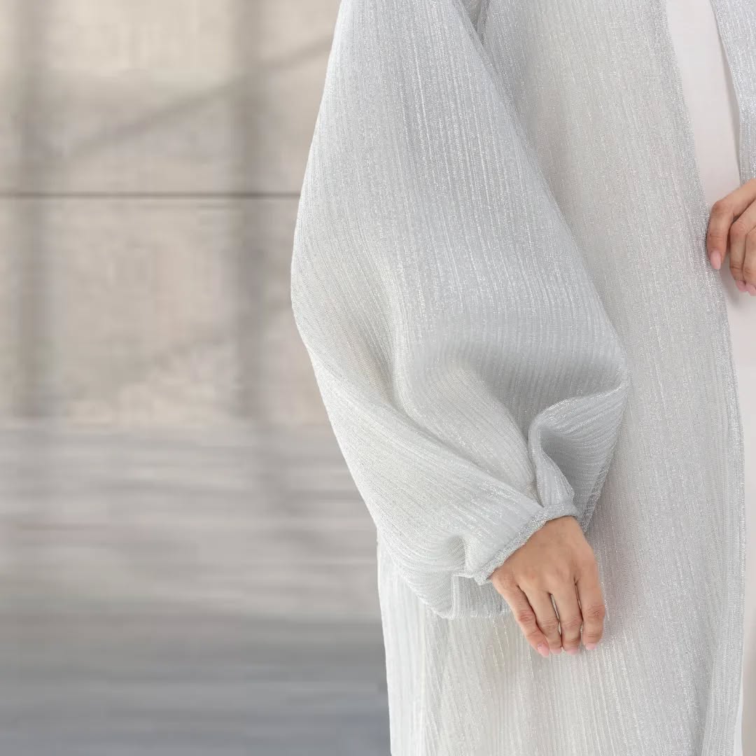 This party abaya is made from a semisheer fabric woven with metallic threads, creating a soft silver shimmer. Its pale grey hue adds to the elegance, while the voluminous balloon sleeves and open-front design. The shimmering texture and sophisticated silhouette make it perfect for festive occasions.