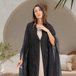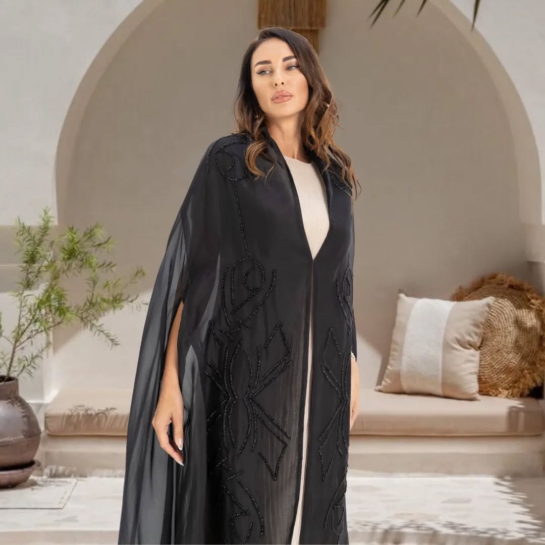 This abaya is made from lightweight black organza, flows elegantly with every step. The front panels are adorned with intricate black beadwork in abstract floral motifs, adding a subtle yet luxurious sparkle. Designed with an open-front style and cape-like slit sleeves, it creates a sophisticated silhouette—perfect for festive gatherings and special occasions.