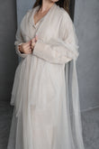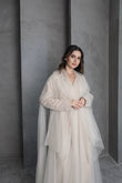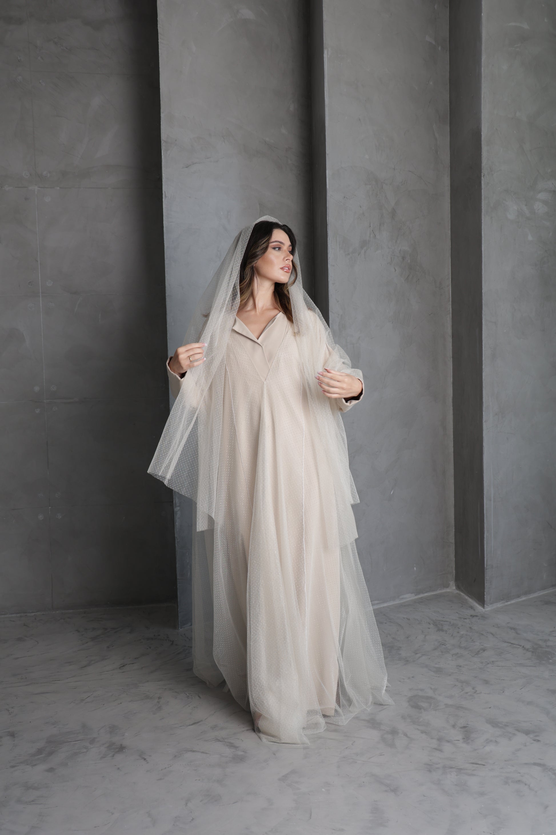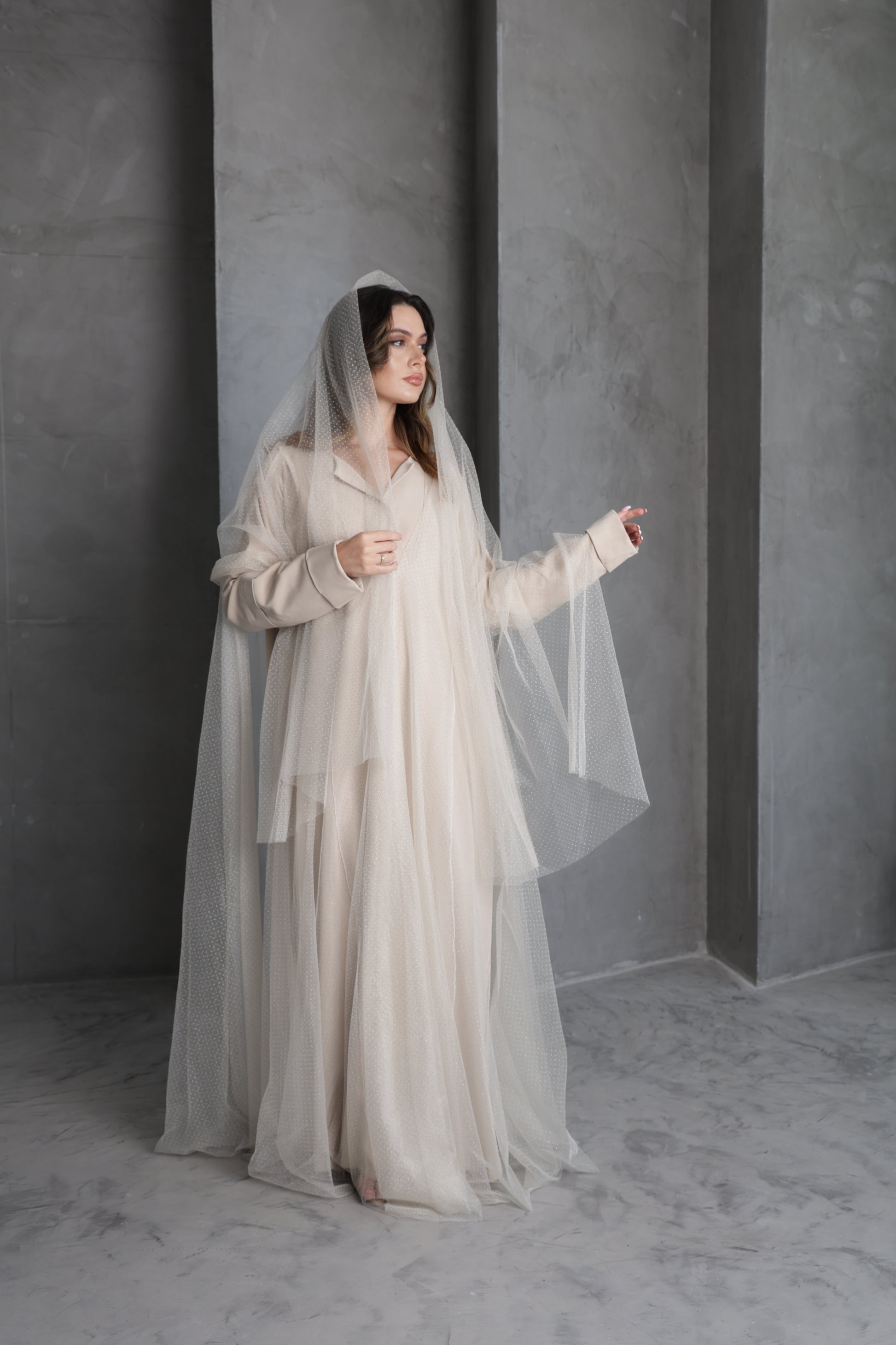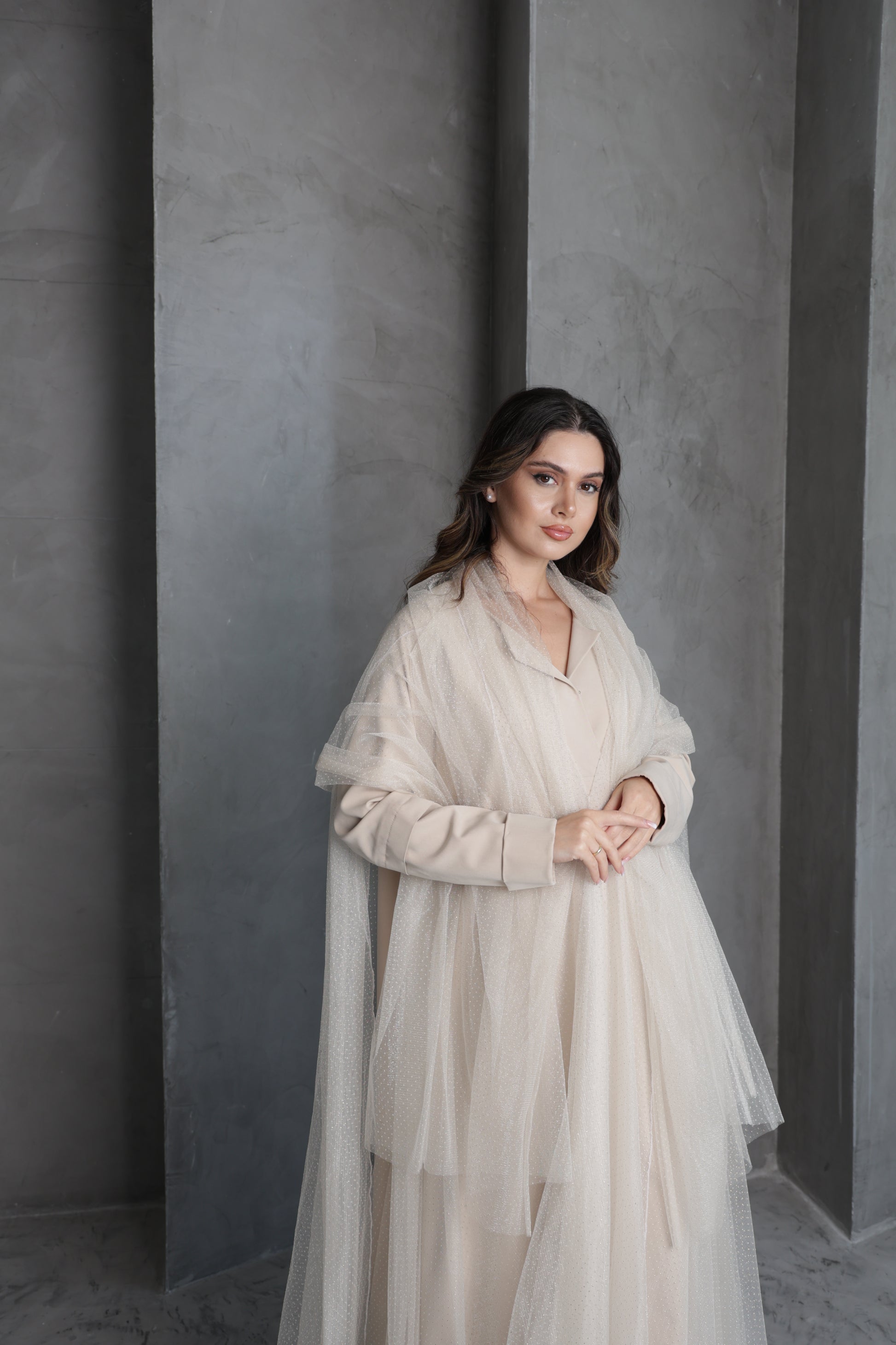 This abaya is a graceful and contemporary piece in a soft beige tone, featuring a flowing silhouette enhanced by a sheer tulle overlay. The overlay is delicately dotted, adding texture and a subtle shimmer to the overall look. It drapes from the shoulders to the hem, creating an ethereal, layered effect. The inner structure of the abaya has a classic collar and clean tailoring, offering a refined balance between modern elegance and timeless modesty—perfect for special events or a chic everyday statement.