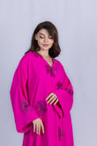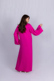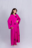 This vibrant fuchsia abaya features a flowy, elegant silhouette adorned with eye-catching floral appliqués embellished with subtle sequins. Designed with wide sleeves and a comfortable drape, it blends modern femininity with a touch of festive charm. Perfect for special occasions, gatherings, or evening events, this abaya brings a bold and stylish statement to any wardrobe.