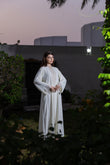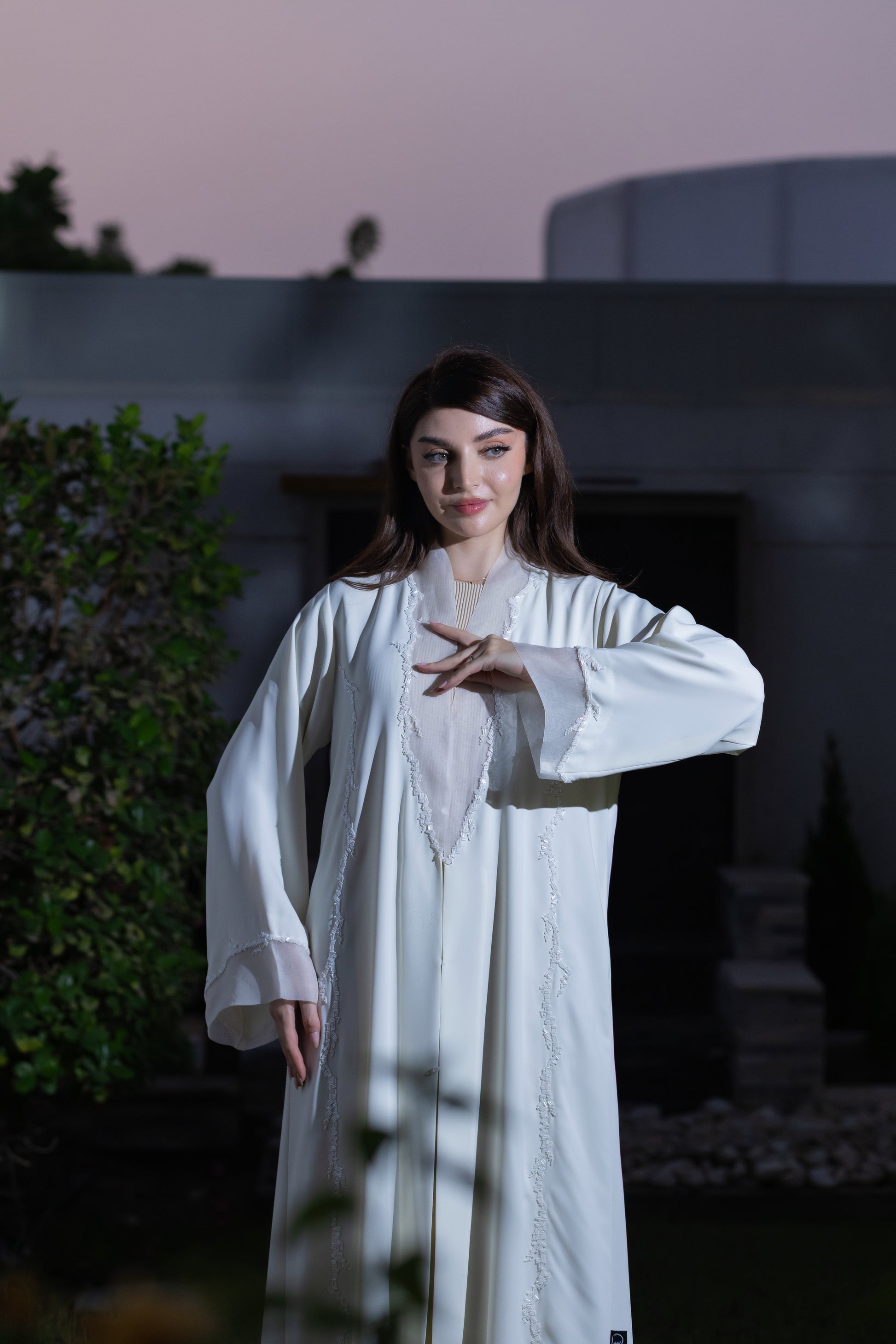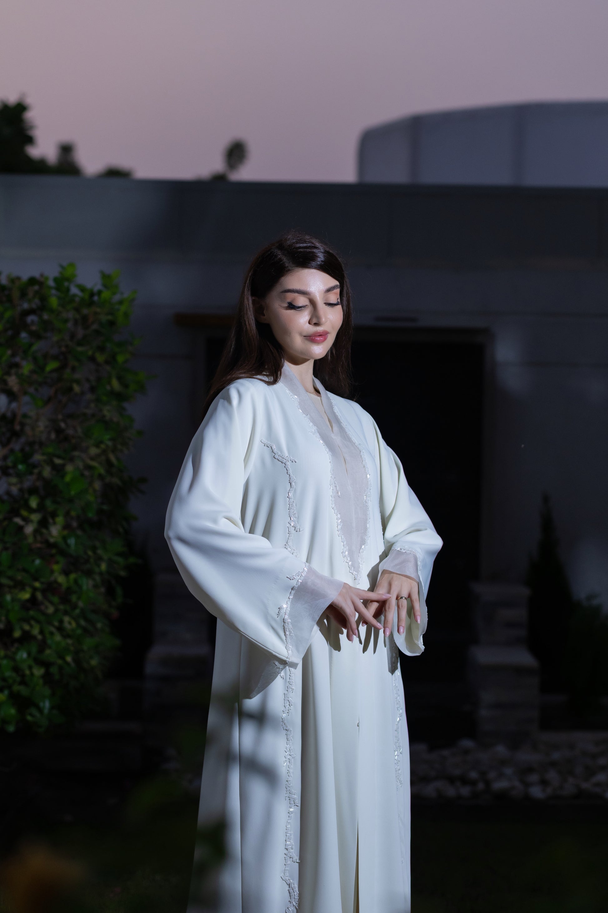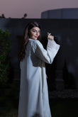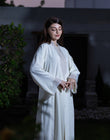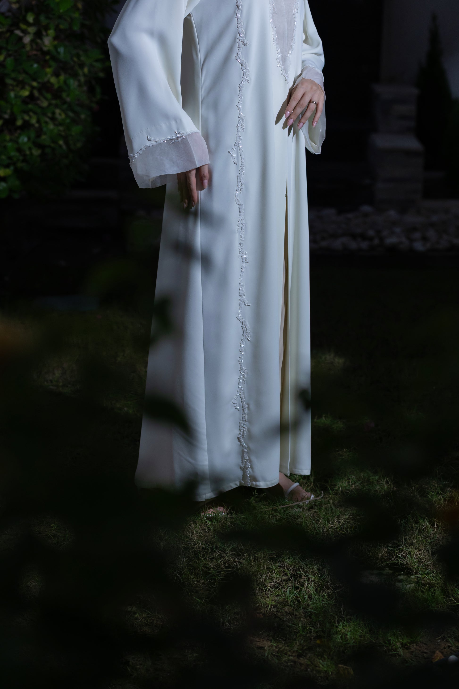 This is a formal ivory abaya featuring vertical lines of delicate beading on the front and sheer, shimmering organza fabric inserts on the chest and cuffs, making it ideal for evening and party wear.
