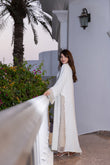 This is a beautiful, formal ivory abaya designed for special occasions. It features an open-front silhouette crafted from a smooth, flowing fabric. The key formal elements are the delicate lace trimming that runs along the front opening and the dramatic sheer, contrasting panel (likely organza or tulle) that forms the lower side and back of the garment, creating a layered, ethereal effect.