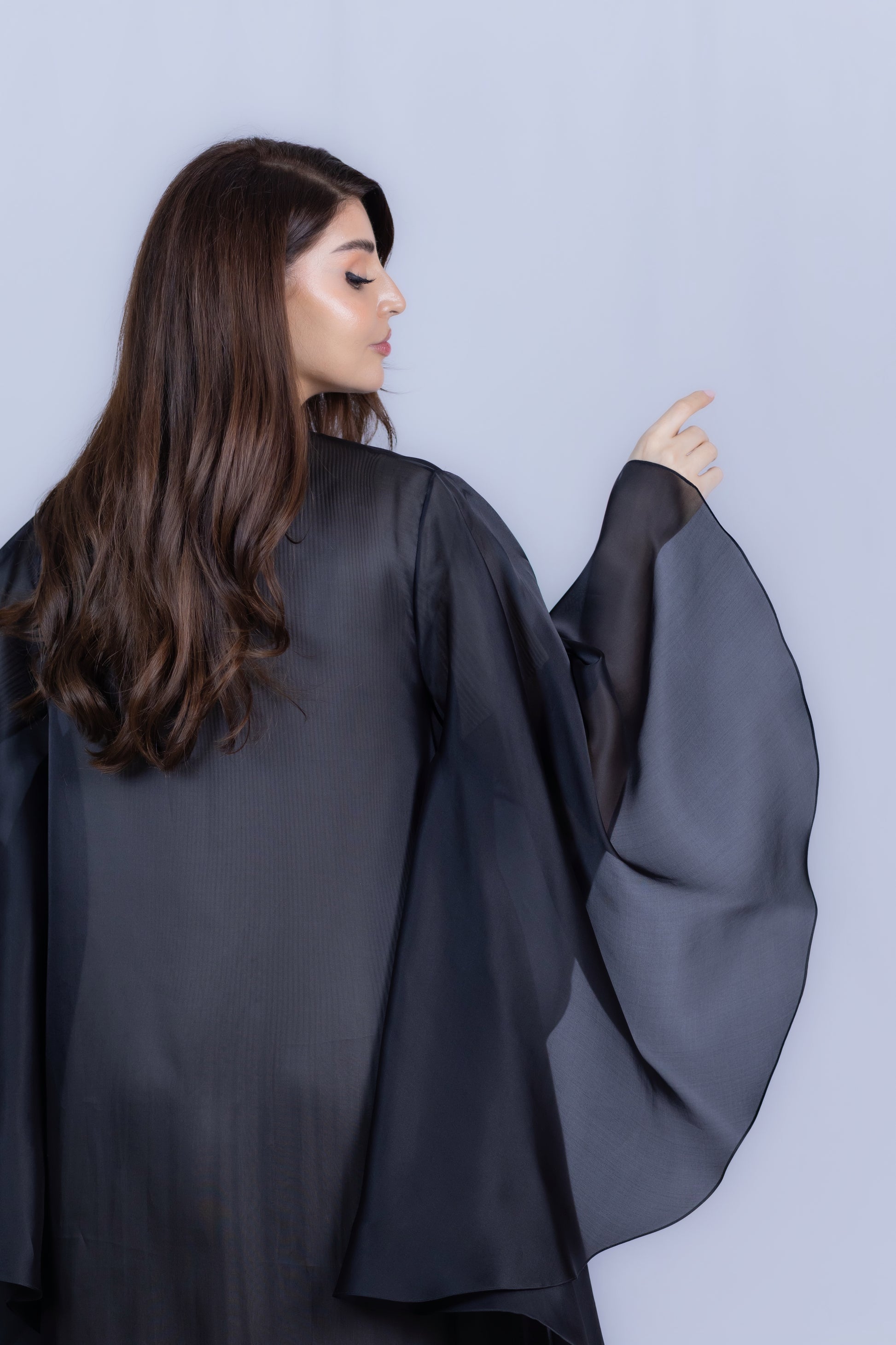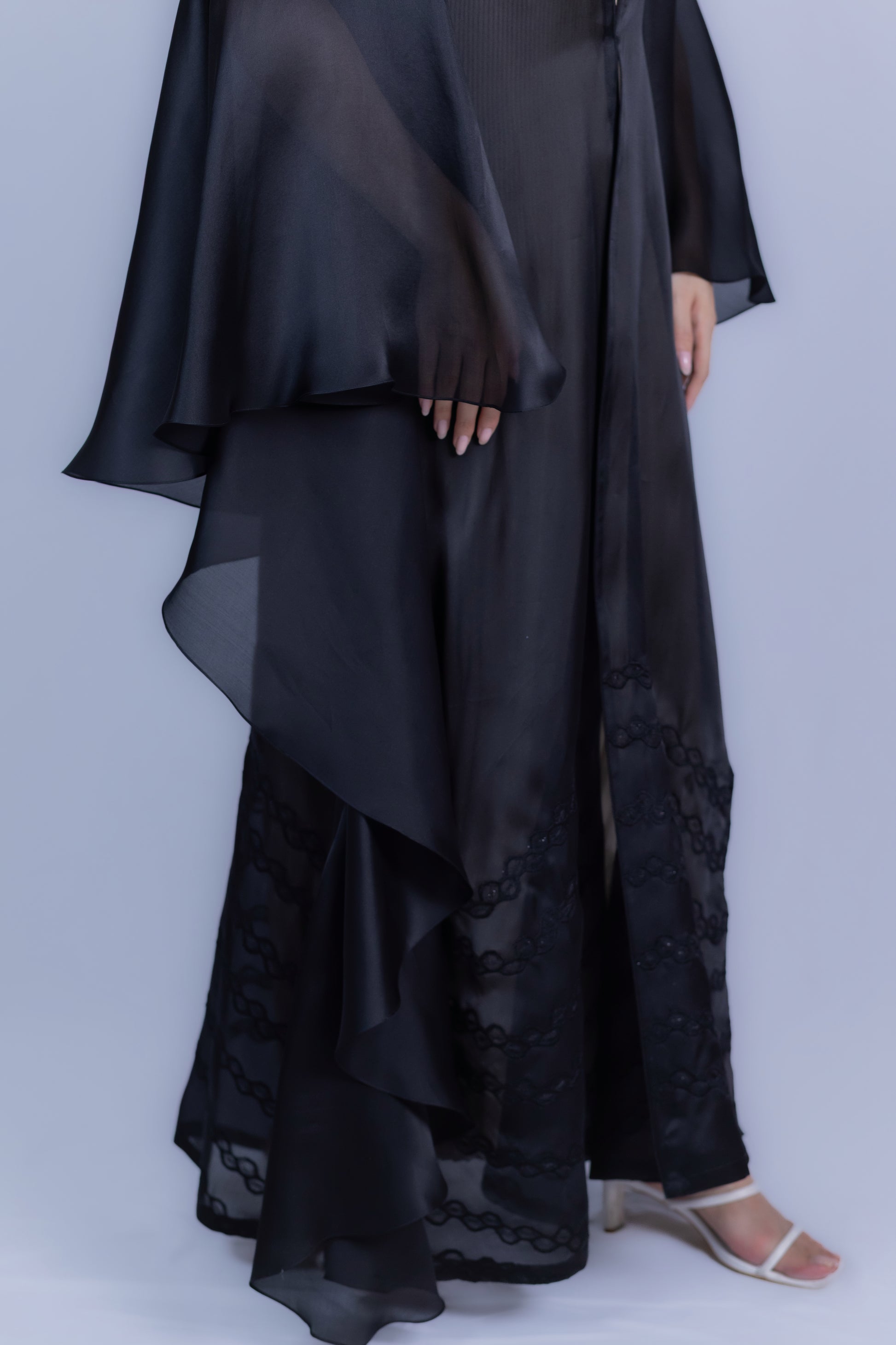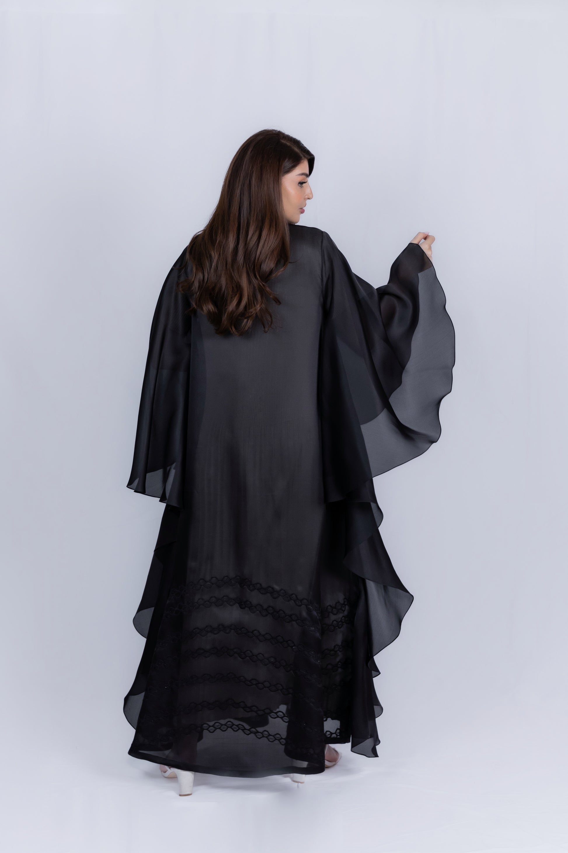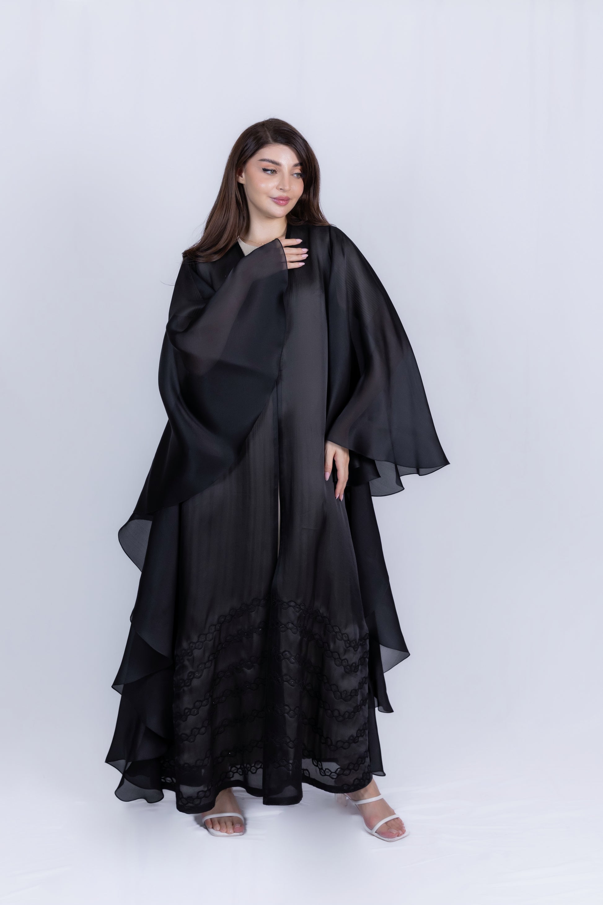 This exquisite abaya features a voluminous, layered silhouette with wide, cascading sleeves crafted from sheer, flowing Organza fabric. The defining highlight is the intricate, detailed machine embroidery panel detailing the lower hemline, adding exceptional depth and sophisticated texture. This statement piece is perfect for making an elegant, powerful impression at weddings, gala dinners, and luxurious evening celebrations.