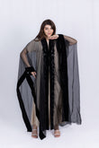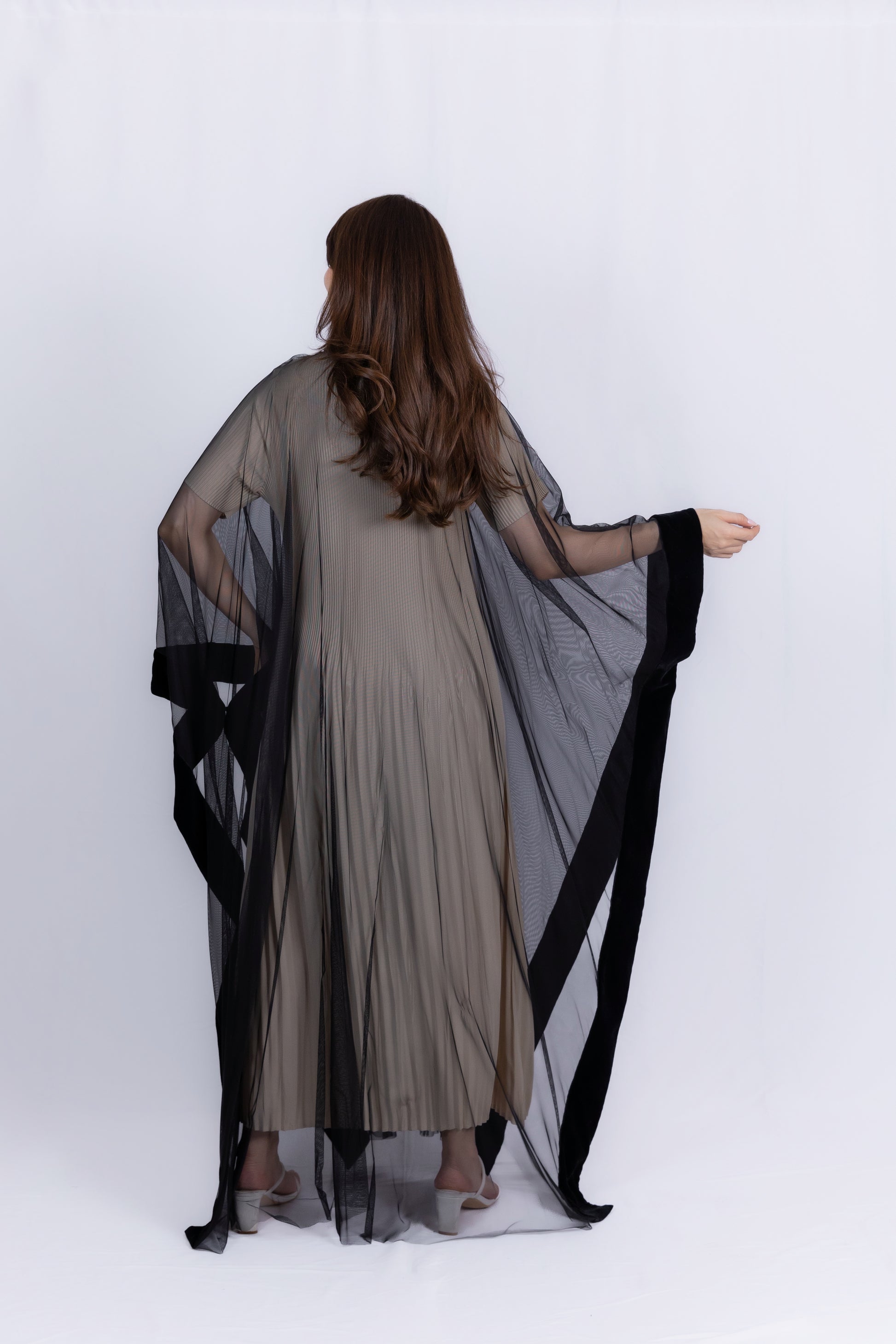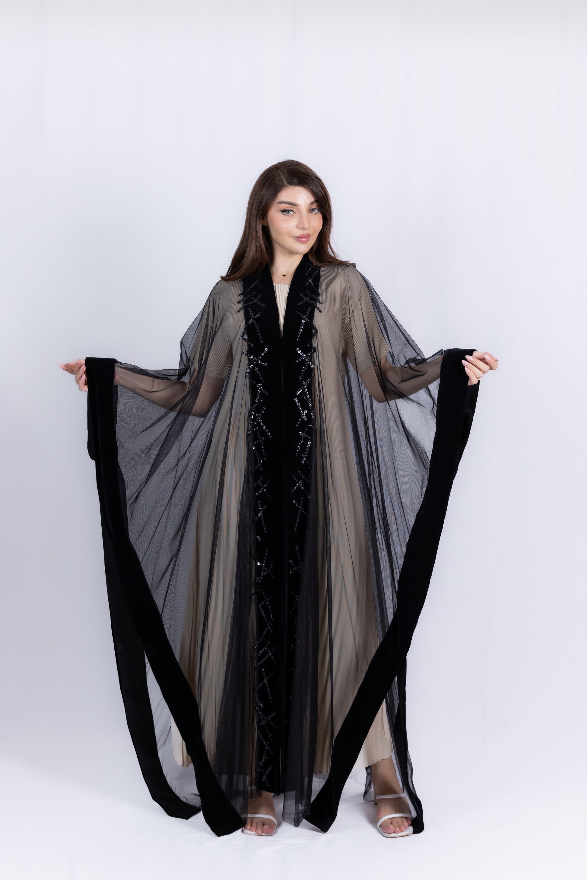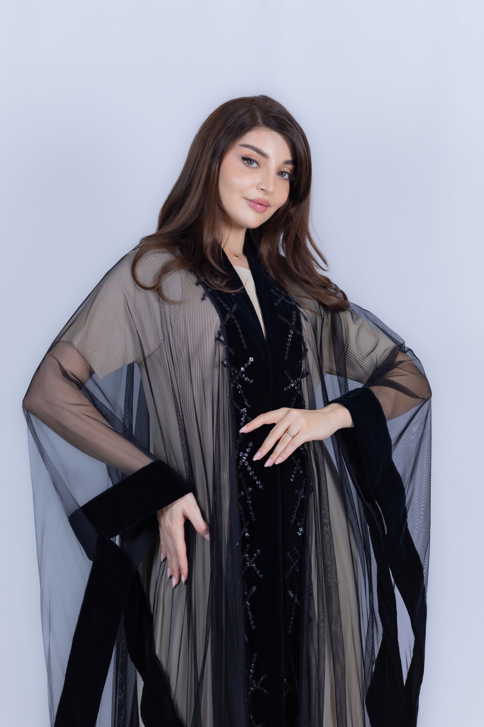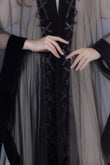 Experience refined elegance with this beautifully designed abaya, crafted from soft, flowing tulle fabric that creates an airy, graceful silhouette. The sheer tulle outer layer drapes effortlessly, offering a modern, lightweight look perfect for both special occasions and elevated everyday wear. Adding a touch of luxury, the abaya features velvet accents on the front panel and cuffs, giving it a rich, sophisticated contrast. The center panel is enhanced with handmade embellishments, adding intricate artistry and a unique, handcrafted finish that sets this piece apart.