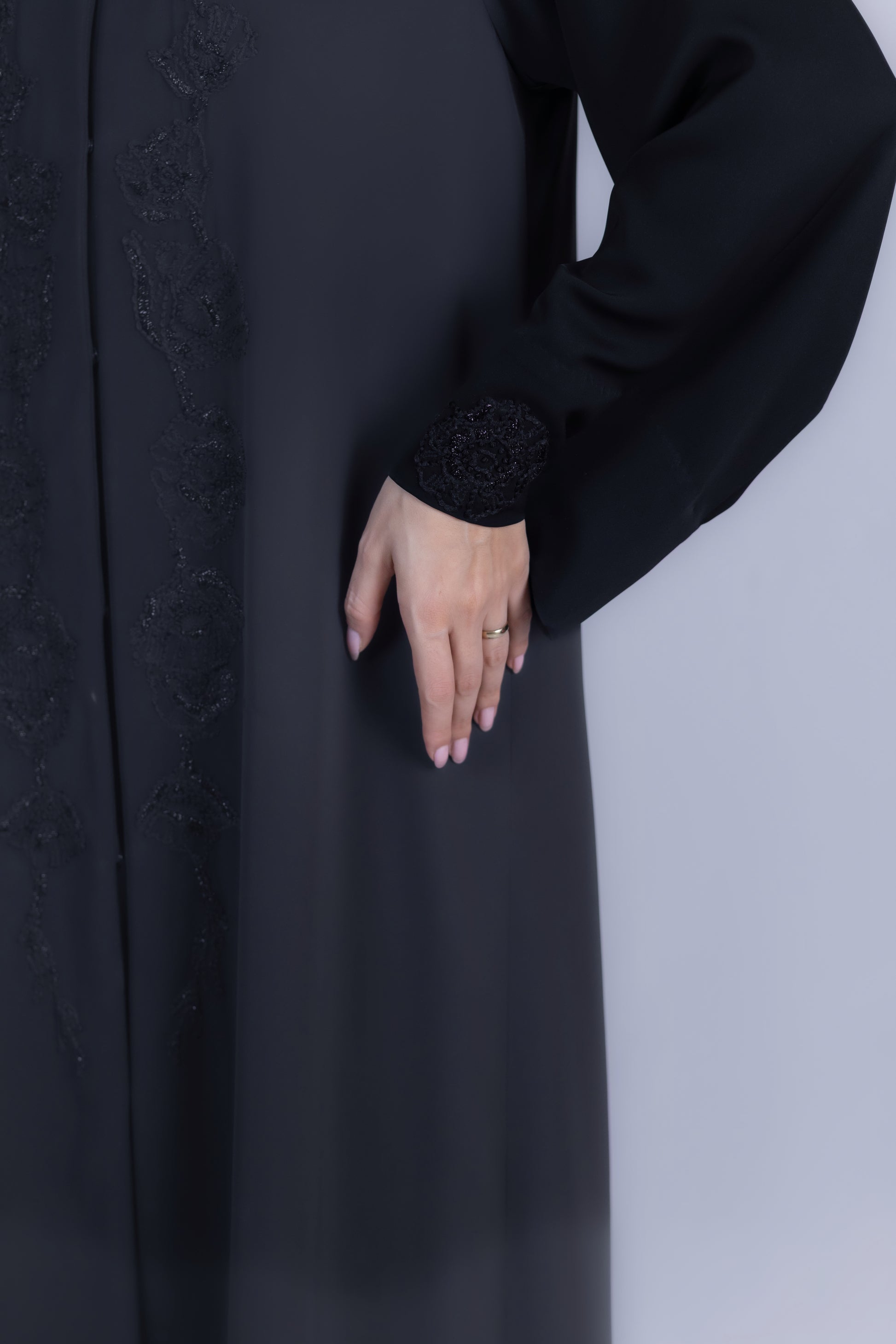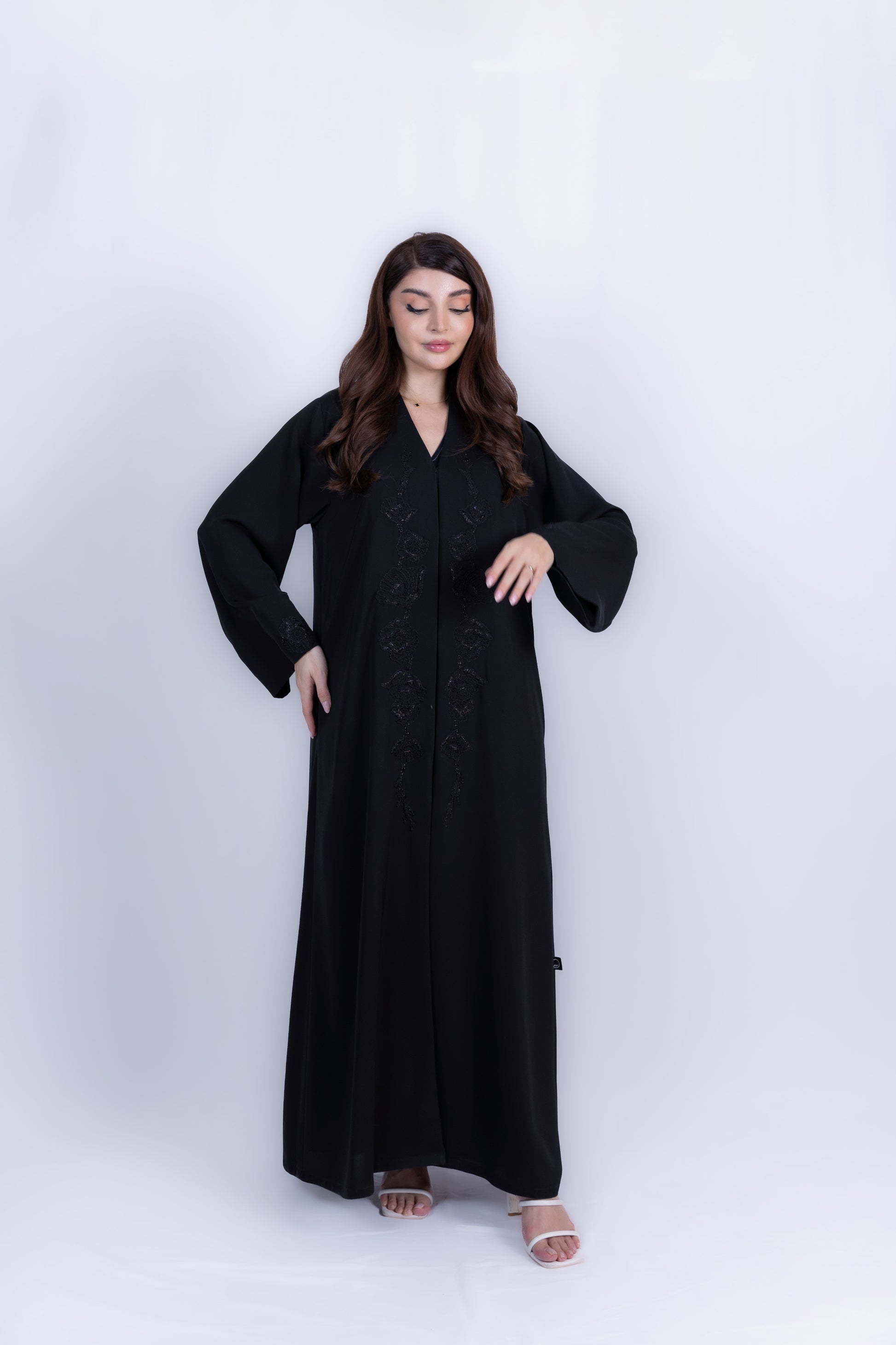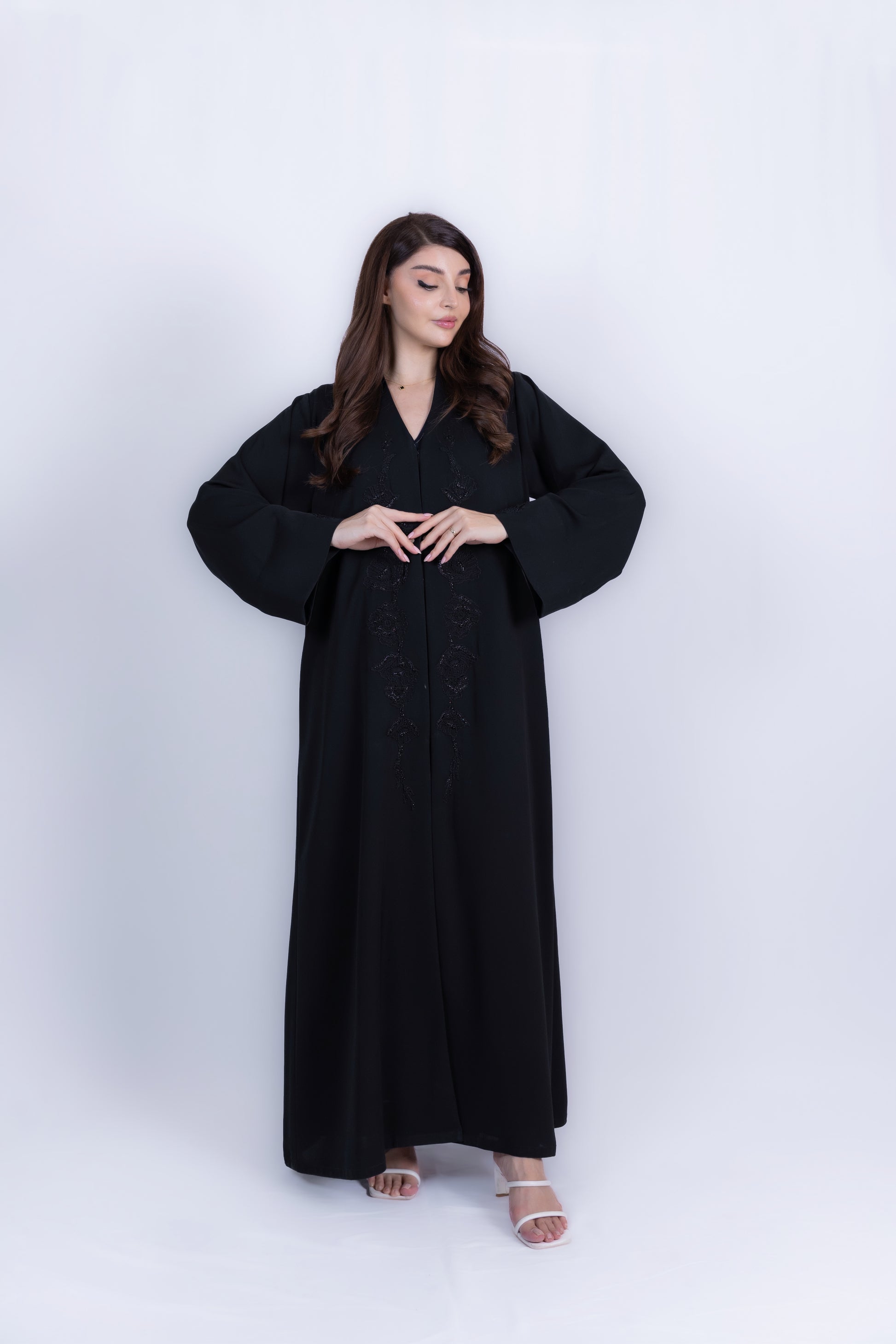 This beautiful black abaya offers sophisticated elegance with stunning detail. Crafted in a smooth, flowing fabric, the modest silhouette is instantly elevated by the meticulous embellishment that runs down the center front. Featuring an intricate, tonal beadwork or sequin design, the detail creates a delicate, shimmering pattern that catches the light beautifully. With its graceful drape and touch of sparkle, this piece is an ideal choice for formal dinners, evening gatherings, and celebratory occasions.
