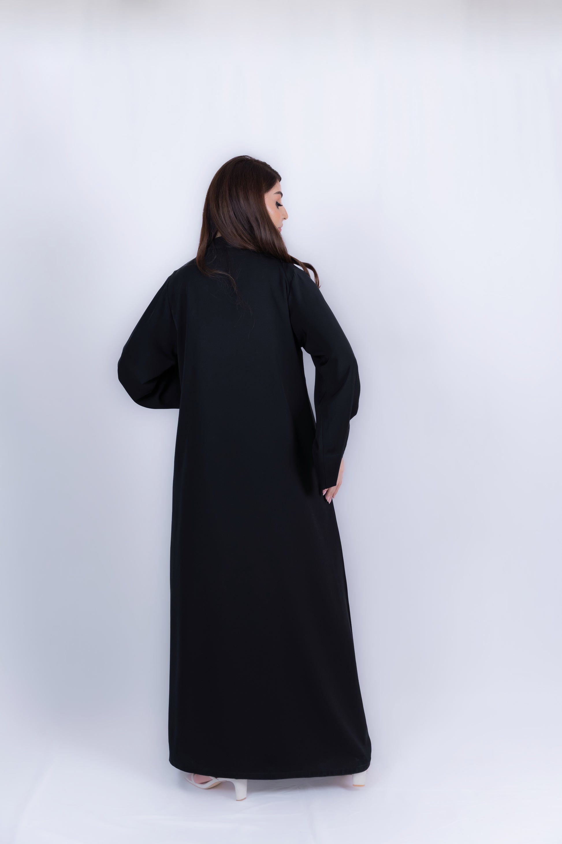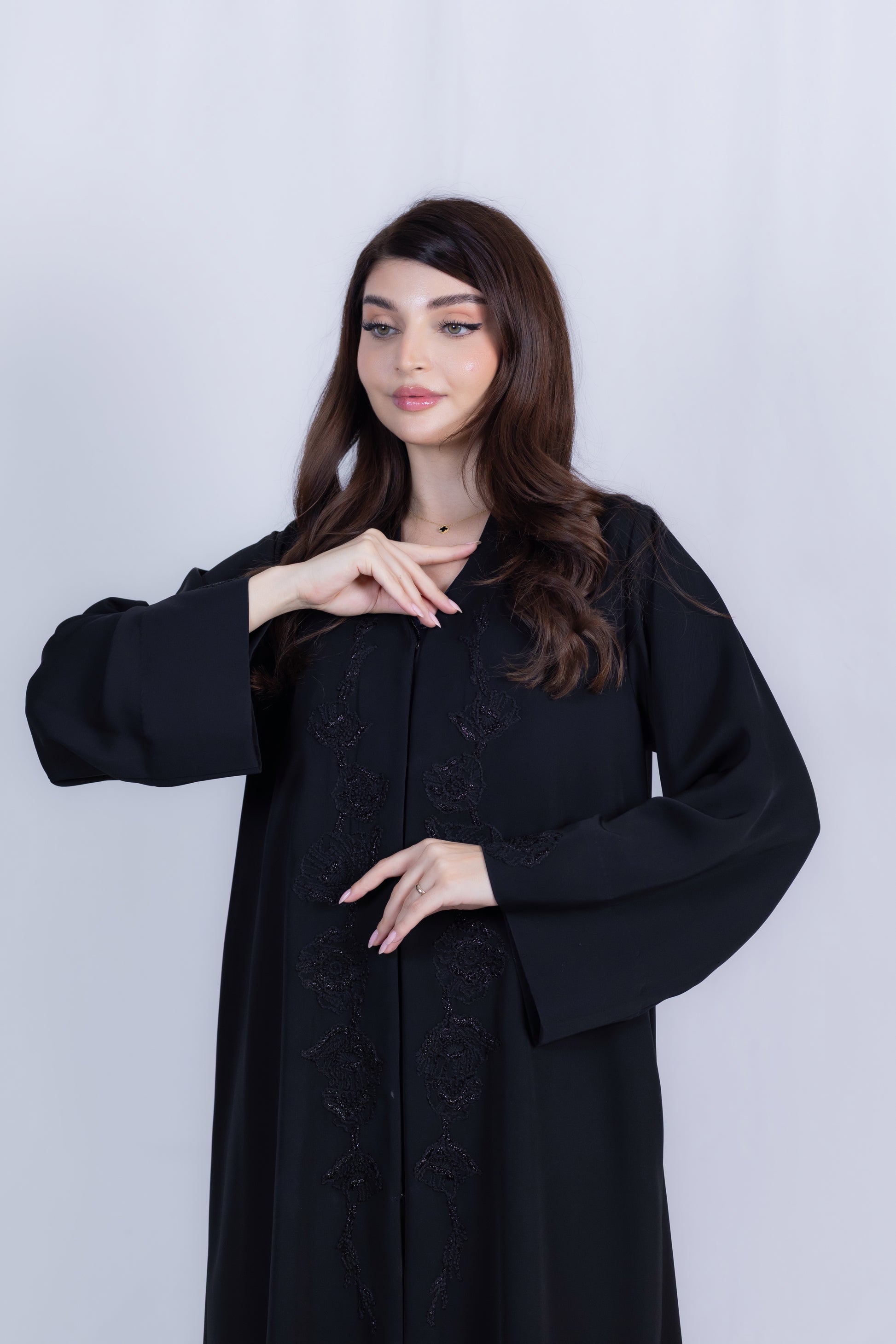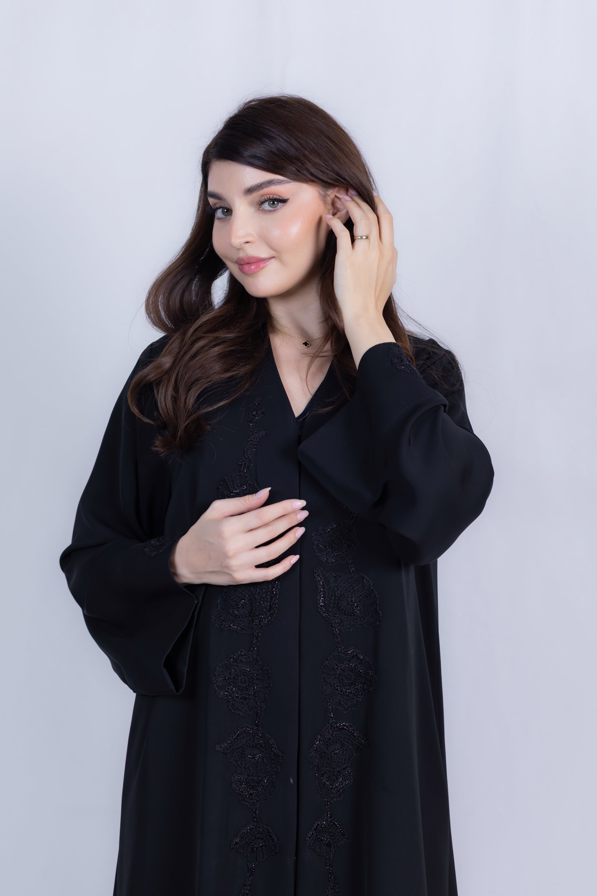 This beautiful black abaya offers sophisticated elegance with stunning detail. Crafted in a smooth, flowing fabric, the modest silhouette is instantly elevated by the meticulous embellishment that runs down the center front. Featuring an intricate, tonal beadwork or sequin design, the detail creates a delicate, shimmering pattern that catches the light beautifully. With its graceful drape and touch of sparkle, this piece is an ideal choice for formal dinners, evening gatherings, and celebratory occasions.